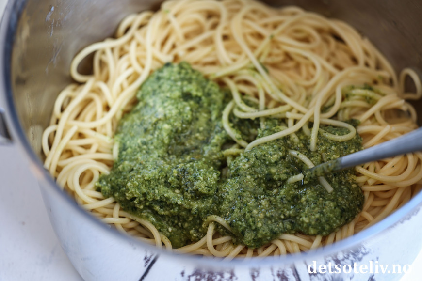 Hell av kokevannet og vend inn ønsket mengde nylaget pesto (se tips).
