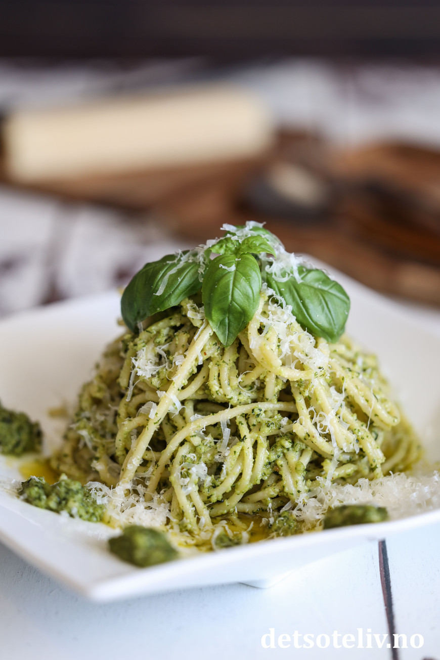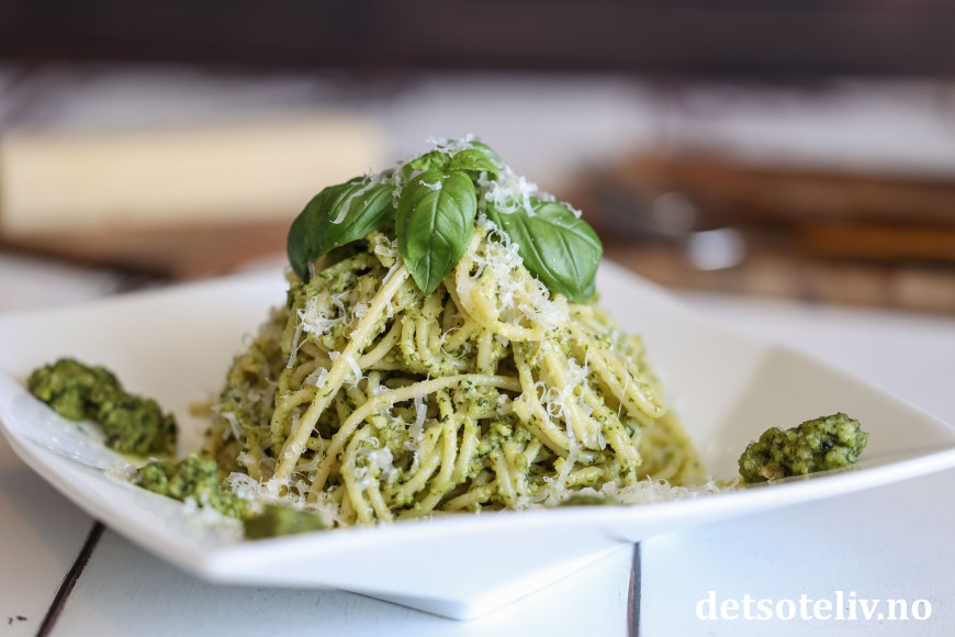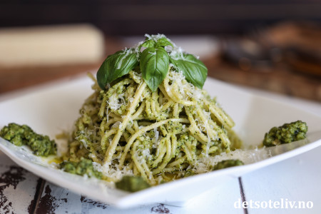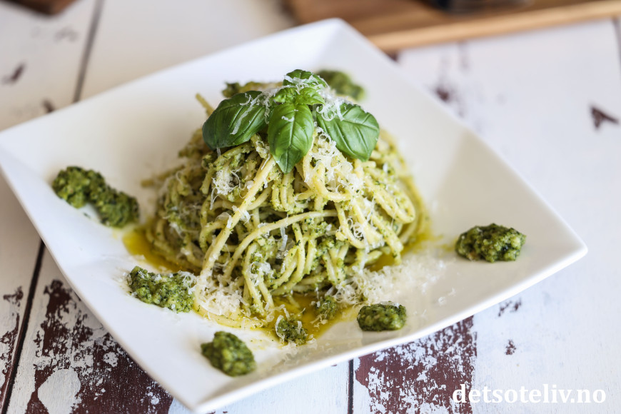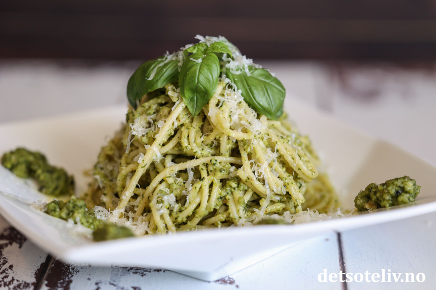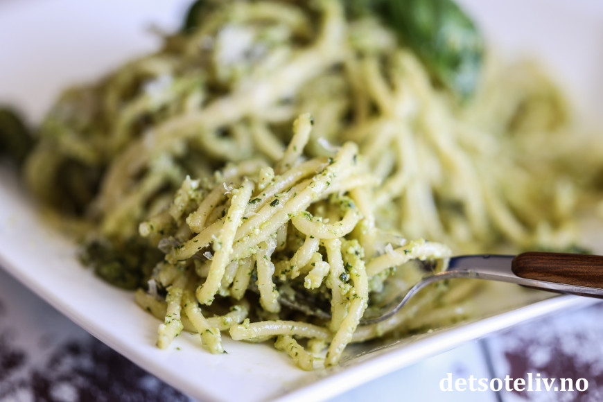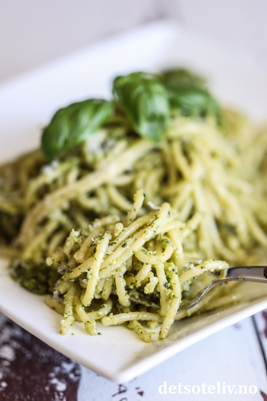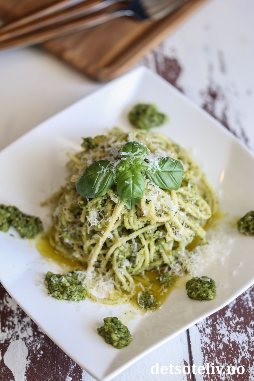 Spagetti med pesto er lettvint å lage og passer derfor fint å servere på sommeren.