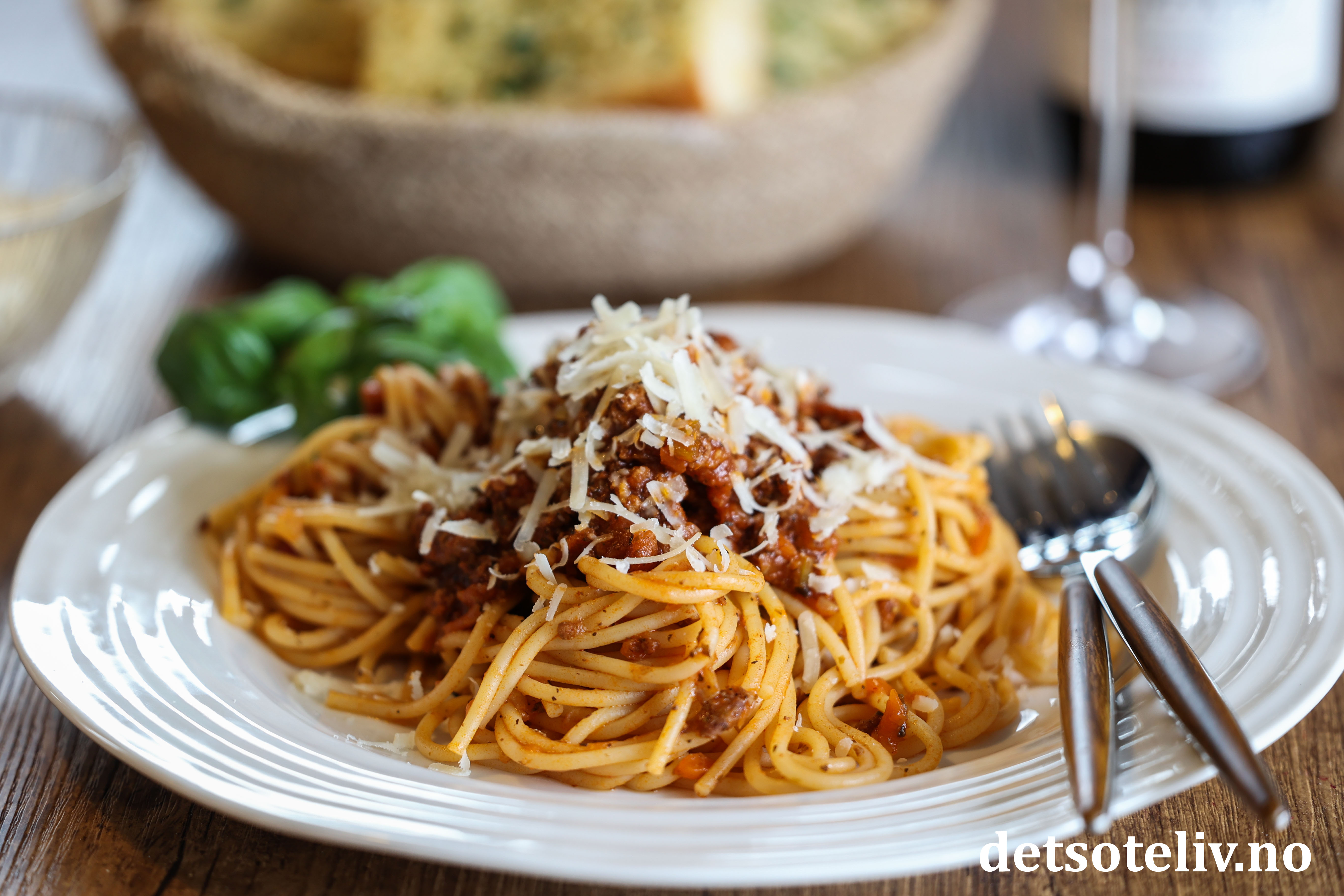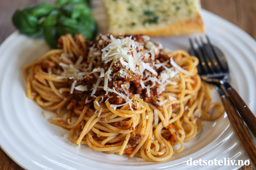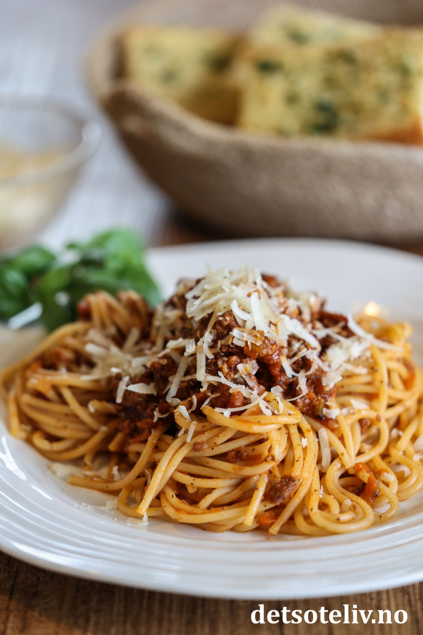 Server spagettien med ekstra kjøttsaus på toppen. Pynt med frisk basilikum og revet parmesanost. Ha gjerne hvitløksbrød som tilbehør (jeg har her brukt Enkle hvitløks- og persillebrød).