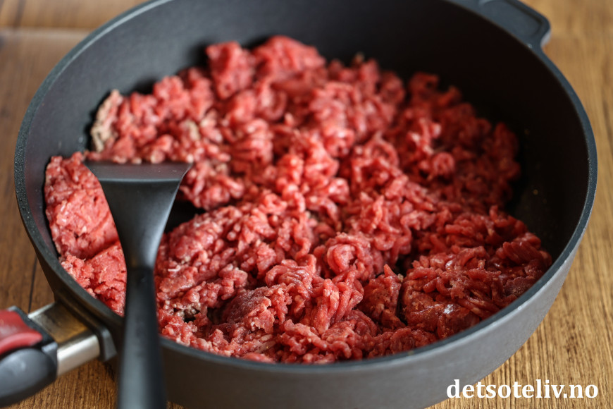 Varm opp et par spiseskjeer olivenolje i en stekepanne og ha kjøttdeigen (jeg pleier å bruke karbonadedeig) i pannen. Stek kjøttdeigen til den er gjennomstekt.