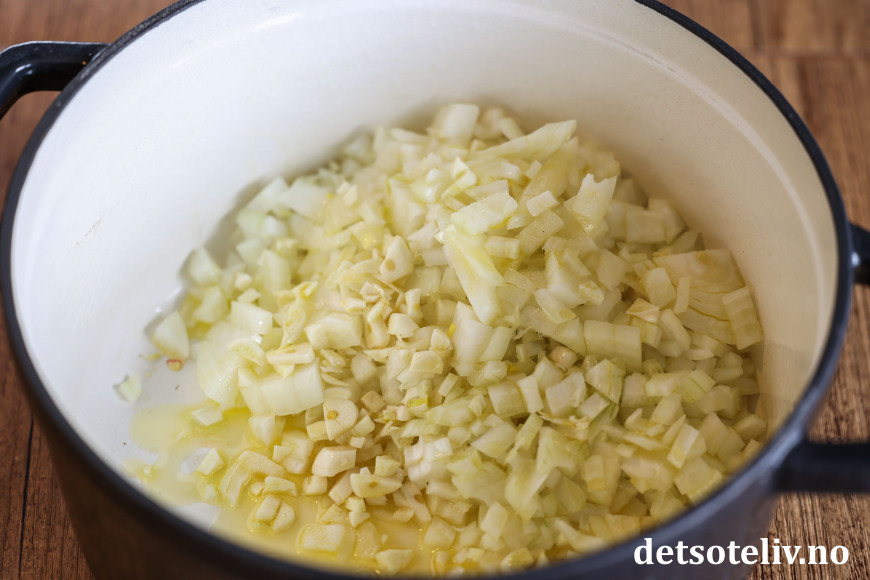 Finn frem en stor gryte og varm opp et par spiseskjeer olivenolje i gryten. Tilsett løk og hvitløk.
