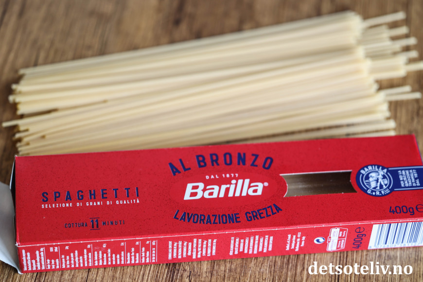 Kok spagettien i en stor kjele med kokende, godt saltet vann. Følg koketiden som angitt på pakken, men stopp et par minutter før spagettien er al dente. Ta til side 1 - 2 dl av pastavannet og hell av resten av vannet.