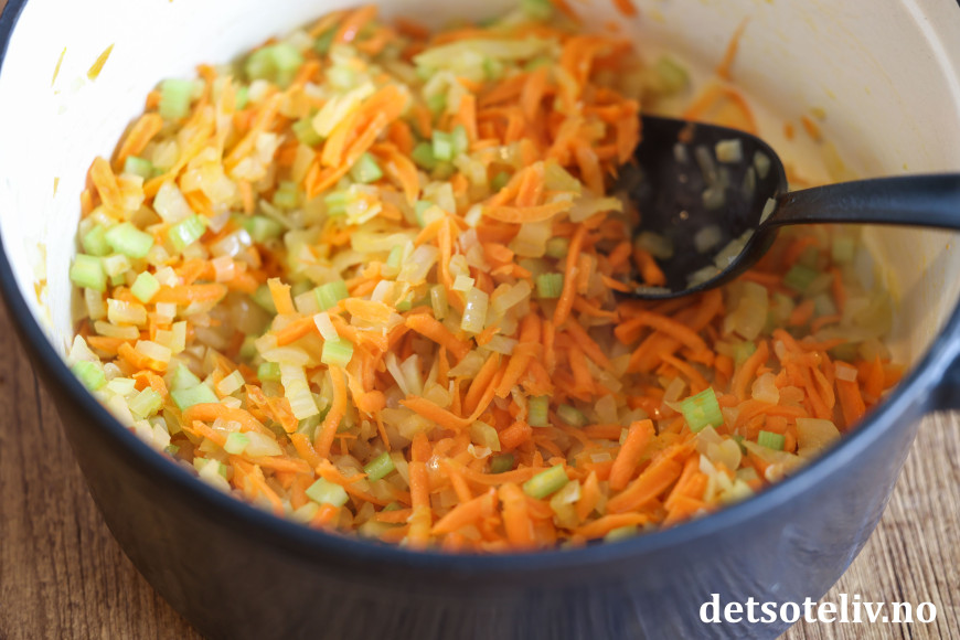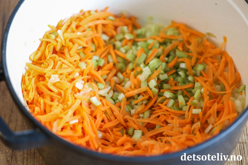 La dette surre i oljen i et par minutter på middels varme, til løken er gyllen. Tilsett revne gulrøtter og selleribitene.
