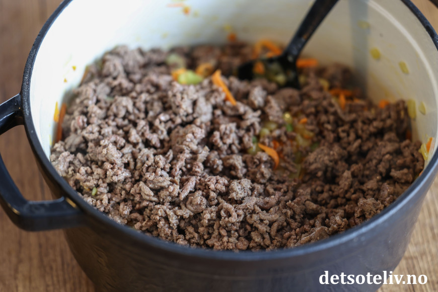 Hakk løk og hvitløk. Riv gulrøttene og skjær selleristengene i små terninger. Finn frem en stor gryte og varm opp et par spiseskjeer olivenolje i gryten. Tilsett løk og hvitløk. La dette surre i oljen i et par minutter på middels varme, til løken er gyllen. Tilsett revne gulrøtter og selleribitene. Bland sammen og la dette steke sammen i et par minutter til. Ha så den stekte kjøttdeigen i gryten.