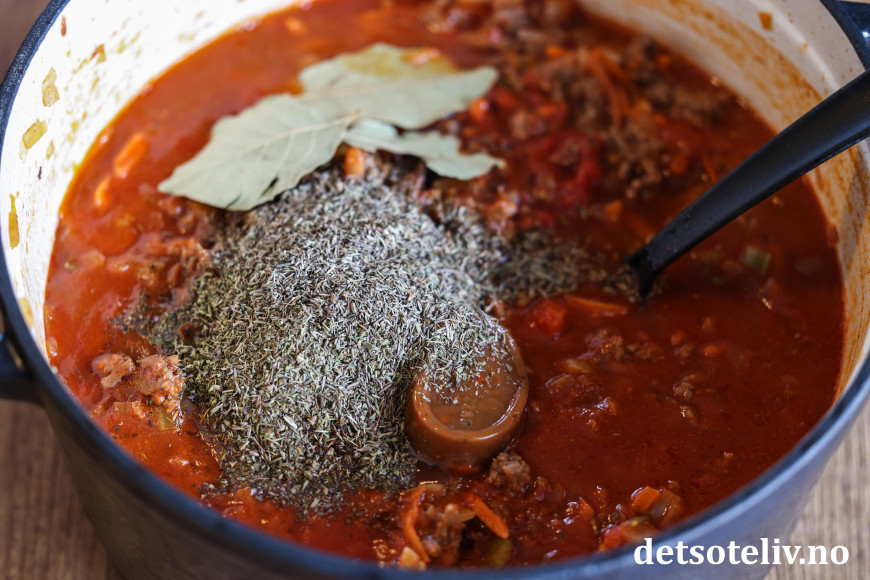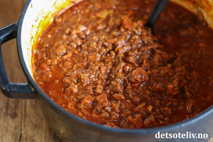♥ Det er viktig at du lar kjøttsausen koke lenge. Smaken er jo god etter kortere koketid også, men tar du deg tid til å la den koke i flere timer, vil konsistensen på sausen bli annerledes fordi løken da nærmest går i oppløsning og tykner sausen. De tørkede urtene vil også bli veldig myke etter flere timers koking. Rør i gryten innimellom. Dersom du har på lokket og passer på at varmen ikke er for sterk, skal det ikke være nødvendig å tilsette mer væske, men spe selvfølgelig med litt ekstra vann dersom du synes at det begynner å bli tørt i bunnen av gryten. Dersom du derimot synes kjøttsausen er for tynn, er det bare å la den småkoke en stund uten lokk.