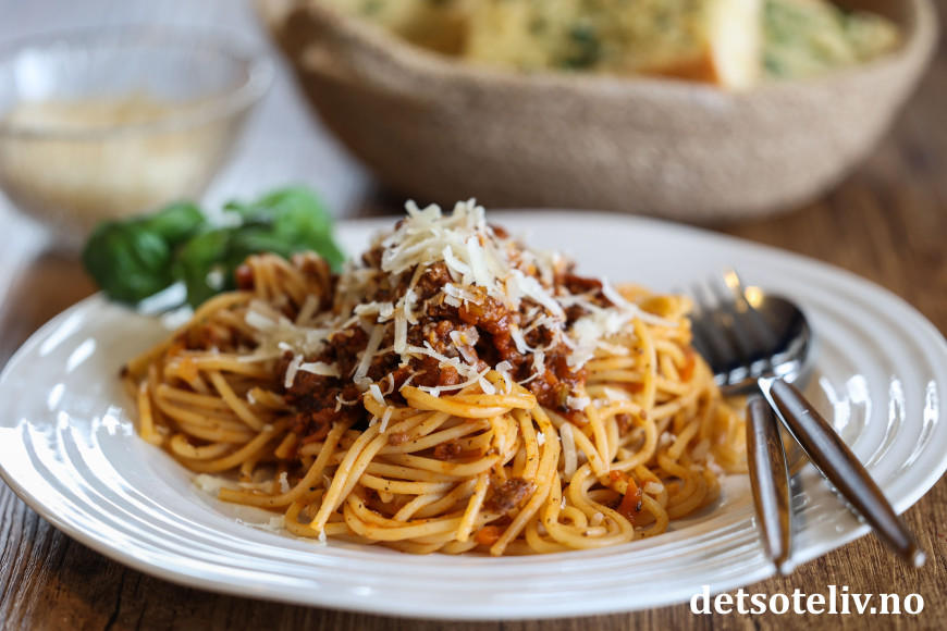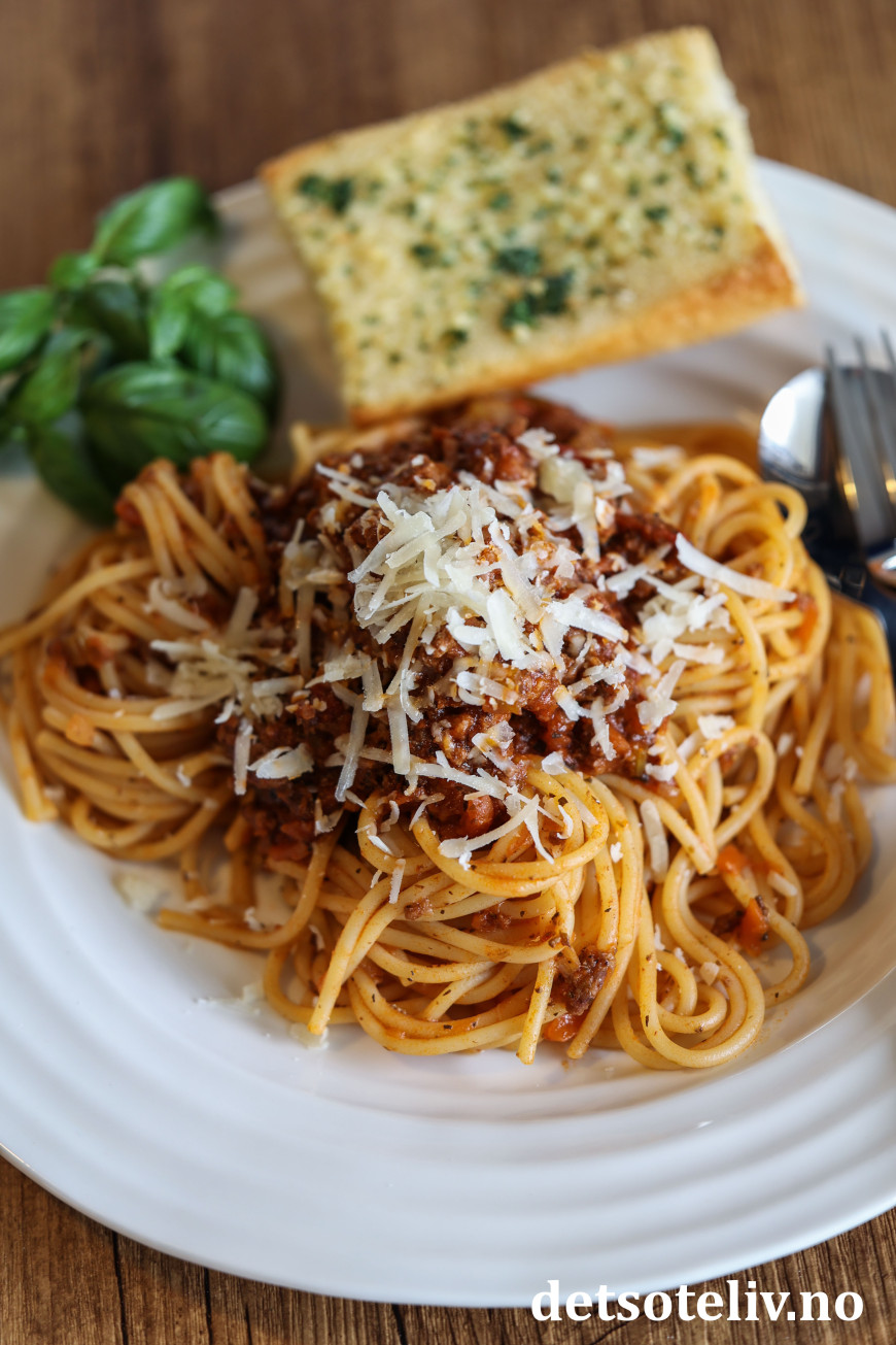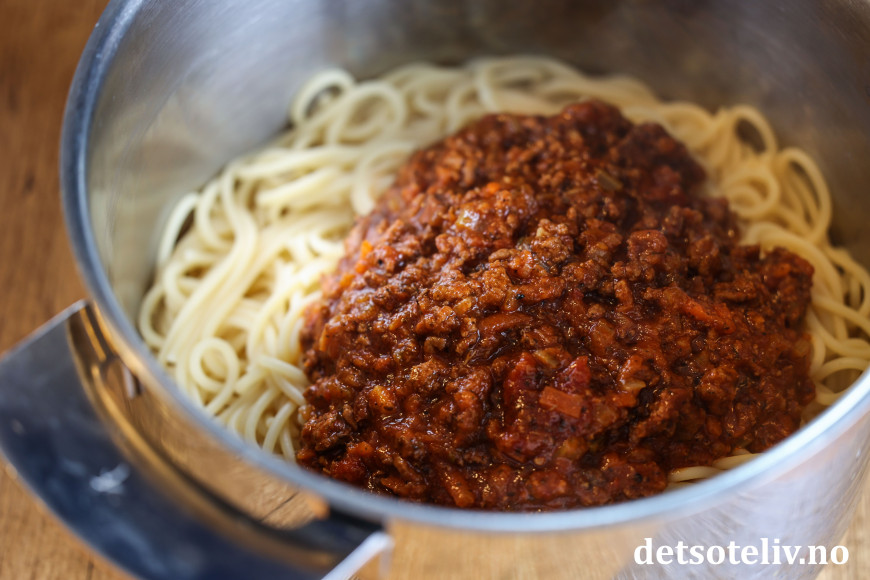 ♥ Denne oppskriften gir mye kjøttsaus fordi det blir best med både noe kjøttsaus blandet med spagettien og ekstra kjøttsaus på toppen av spagettien ved servering. 😊 Får du kjøttsaus til overs, er den fin å fryse.