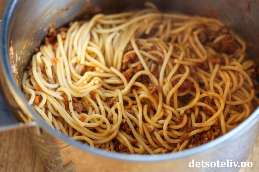Ha så kjelen med den kokte spagettien og en del av pastavannet tilbake på platen og tilsett omtrent halvparten av kjøttsausen. La dette koke sammen i et par minutter til spagettien er akkurat passe kokt. Spe med litt mer pastavann underveis så ikke pastaen blir tørr.