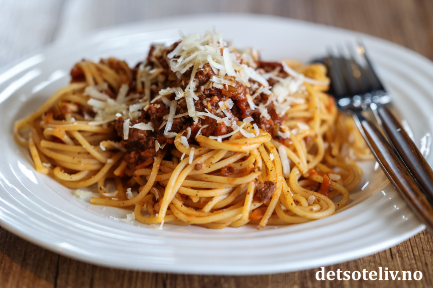 Jeg skal snart lage Tagliatelle al ragù bolognese slik vi fikk retten servert i Bologna. Her får du først den klassiske oppskriften på Spaghetti alla bolognese som jeg har brukt i alle år, og som er familiens favoritt! Som sagt er kjøttsausen her temmelig lik den originale, selv om jeg nå har skjønt at den gjerne også kan tilsettes en skvett hvitvin, fløte og pancetta (italiensk bacon).