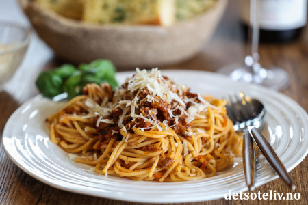 ♥ Bruk spagetti av god kvalitet, som binder til seg den gode sausen. Pass nøye på koketiden så spagettien ikke blir for mye kokt. Det høyner smaken betydelig at spagettien får koke sammen med en del av kjøttsausen på slutten av koketiden.