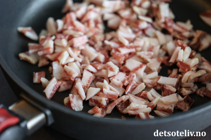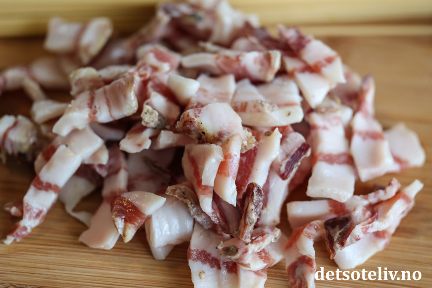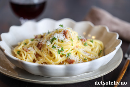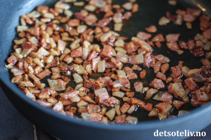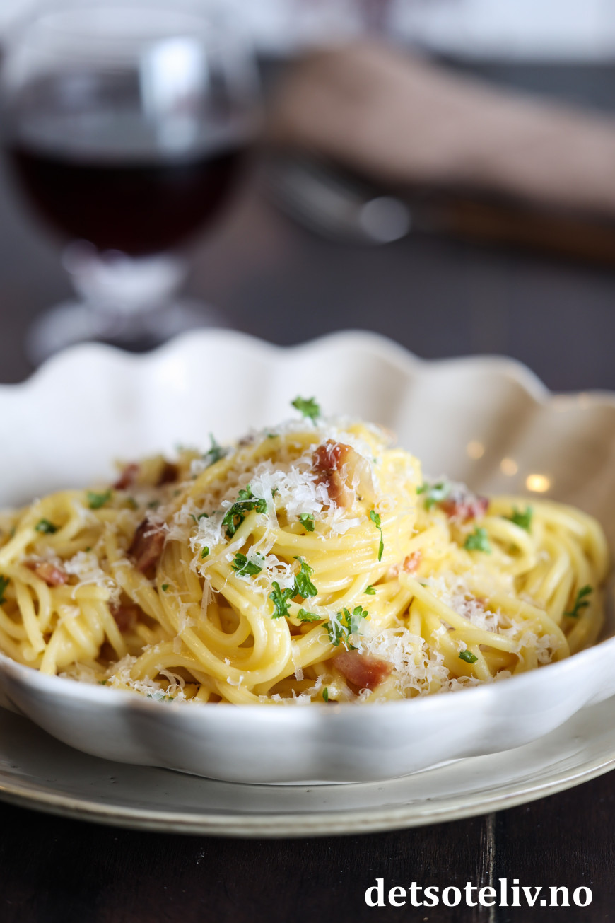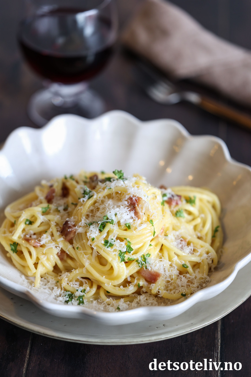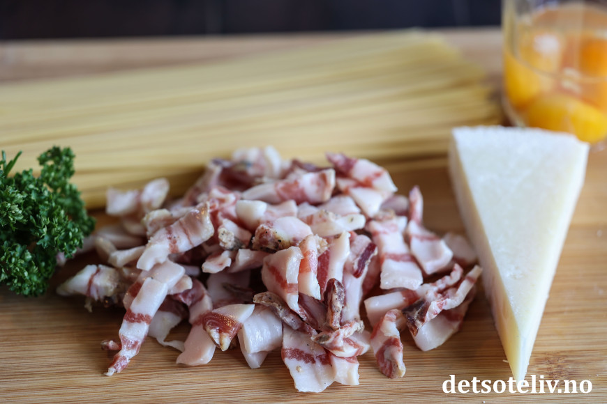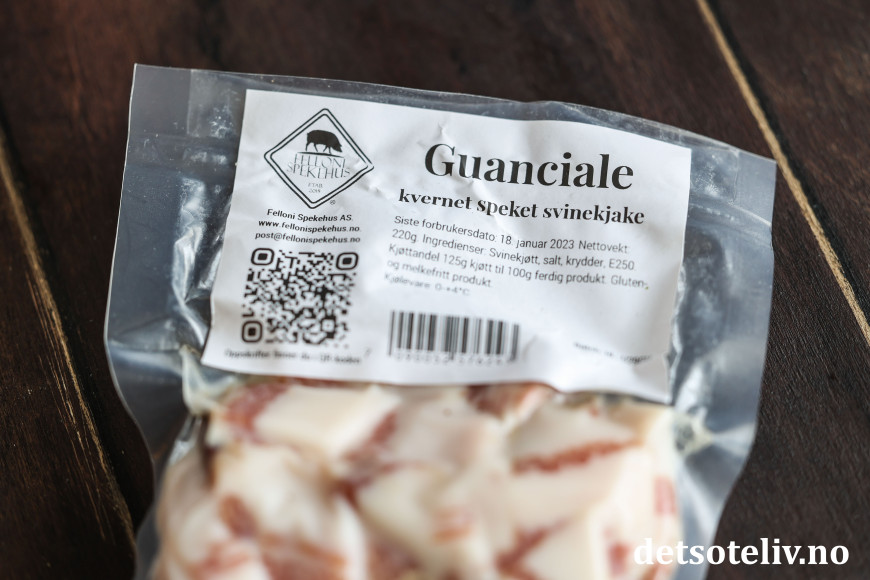 Dersom du ikke har ekte italiensk guanciale eller pancetta, går det også helt greit å bruke vanlig bacon, men bruk gjerne et stykke som du skjærer i små terninger i stedet for tynne baconskiver (selv om det selvsagt også blir bra).