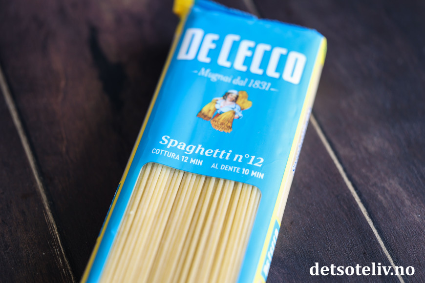 ♥ Det er et poeng å bruke spagetti av litt god kvalitet. Dette er viktig ikke bare for smaken, men spagetti av bedre kvalitet har gjerne en ikke så glatt overflate som gjør at sausen fester seg bedre til spagettien. Jeg bruker her spaghetti, men du kan også gjerne bruke bucatini, som er en litt tykkere variant av spagetti som er hule inni. Det er også populært å lage denne retten med andre varianter av pasta, slik som linguini eller tagliatelle (båndspaghetti). Jeg bruker her tørr pasta, men du kan også bruke fersk pasta. Koketiden må da kortes ned til det som er anvist på pakningen.