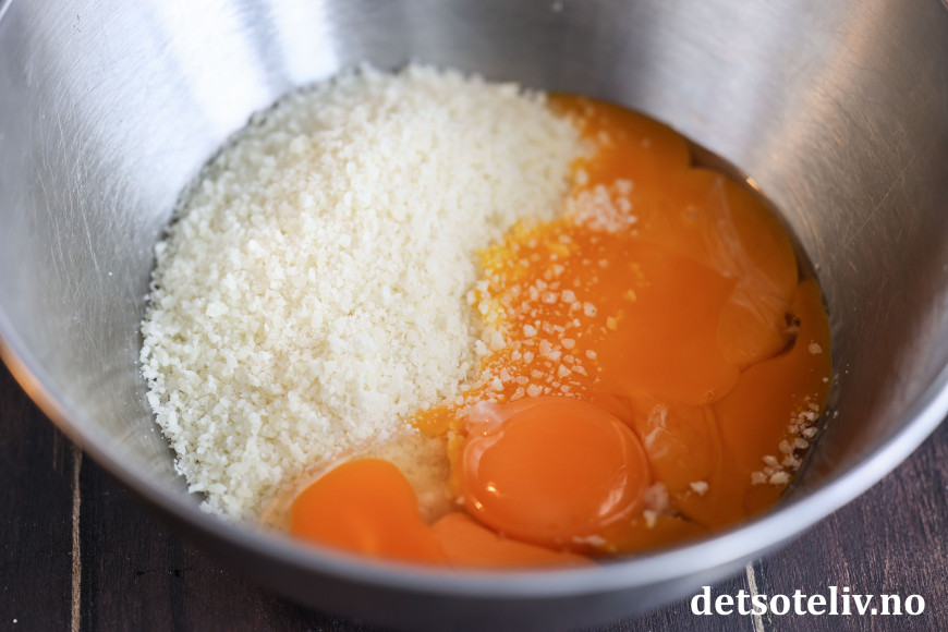 Ha den revne osten i en skål sammen med eggeplommene og det hele egget.