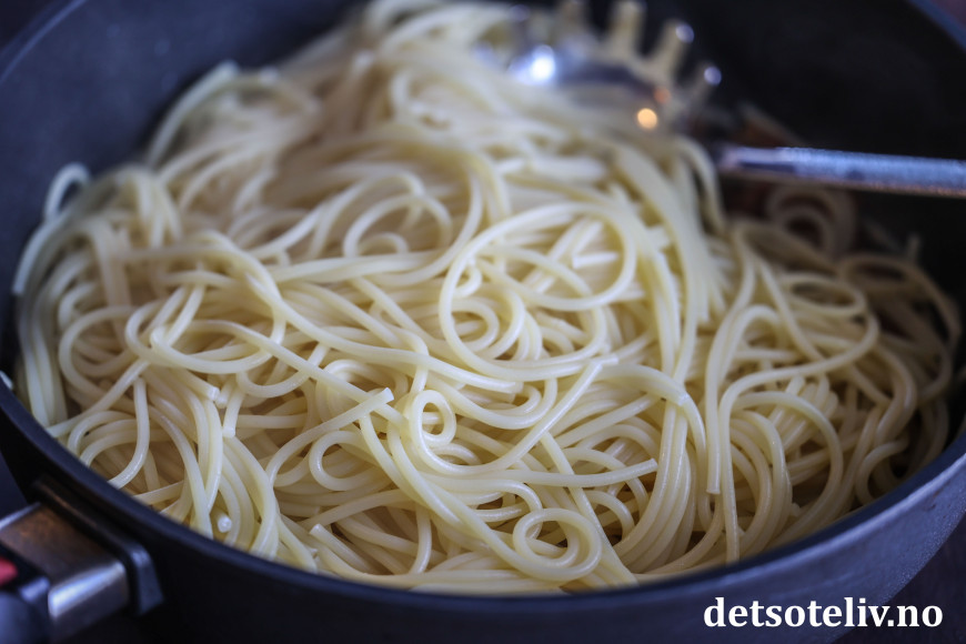 Kok spagetti i saltet vann (bruk 1 ss salt per liter vann) til den er al dente (følg anvisningen på pakken).