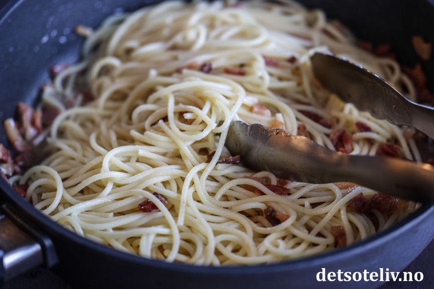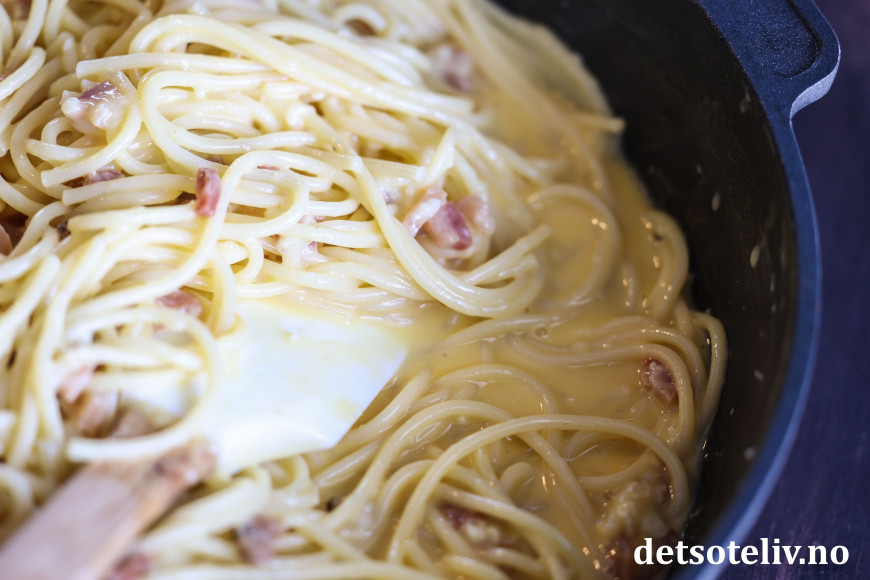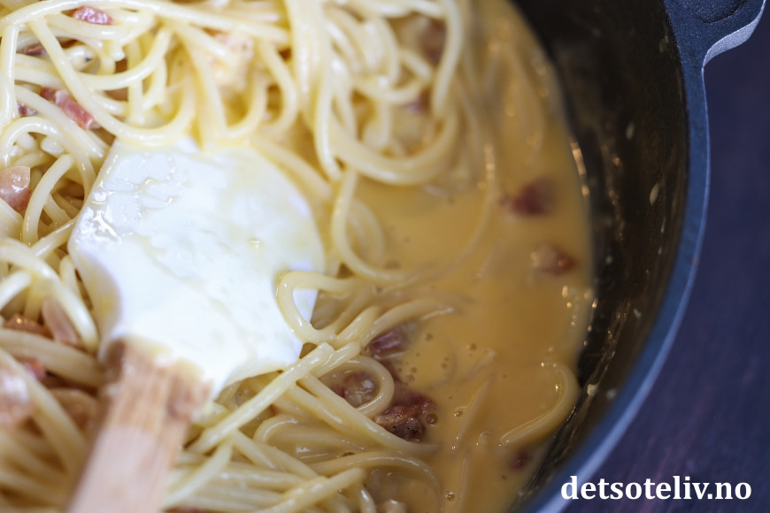 For det andre er det viktig at spagettien er varm nok til at sausen tykner, men ikke så varm at eggeblandingen koagulerer (som eggerøre) og gir en kornete saus. Jeg tar alltid stekepannen av varmen før jeg blander inn egge- og osteblandingen.
