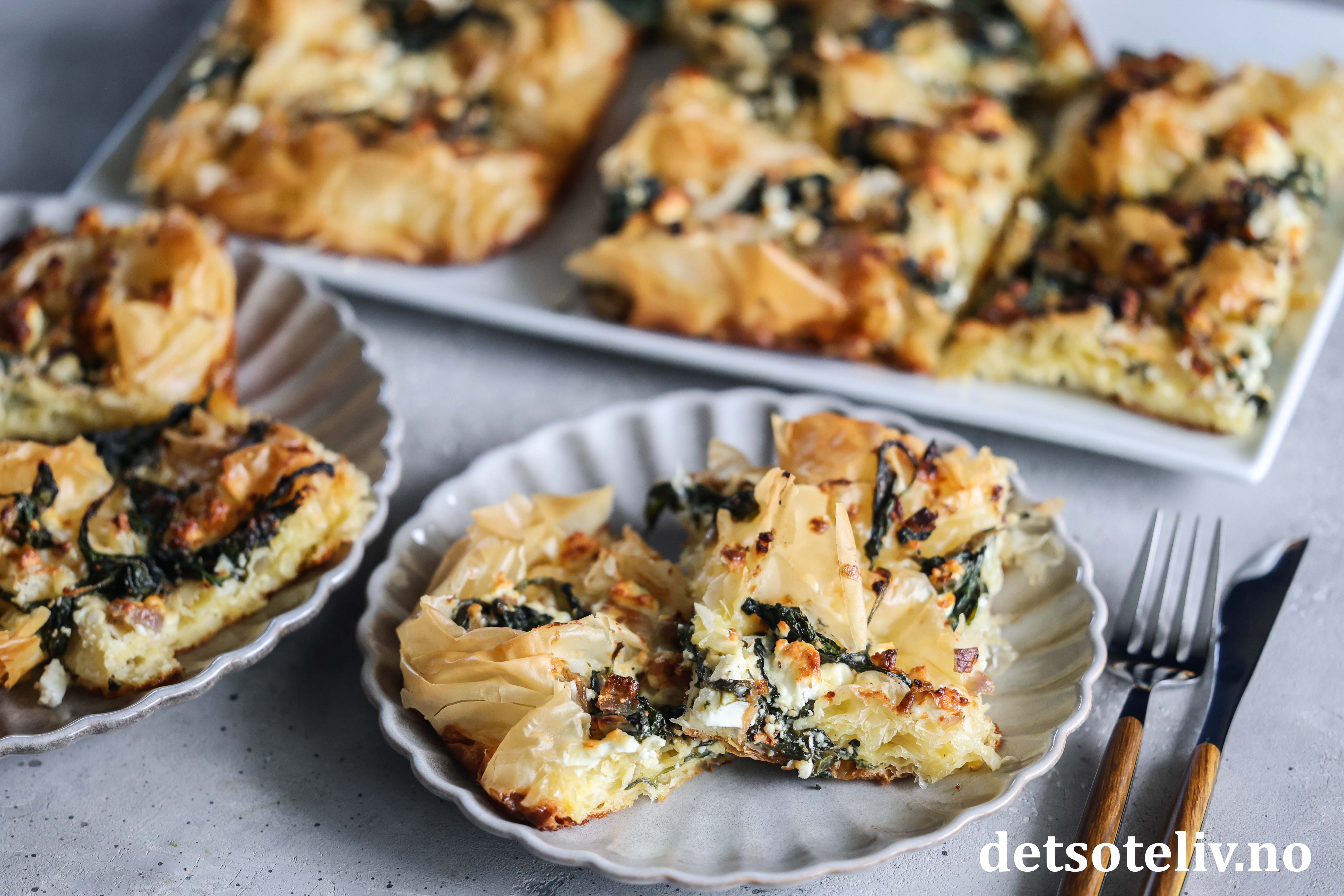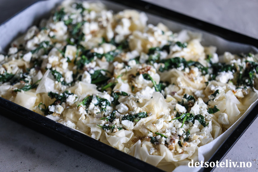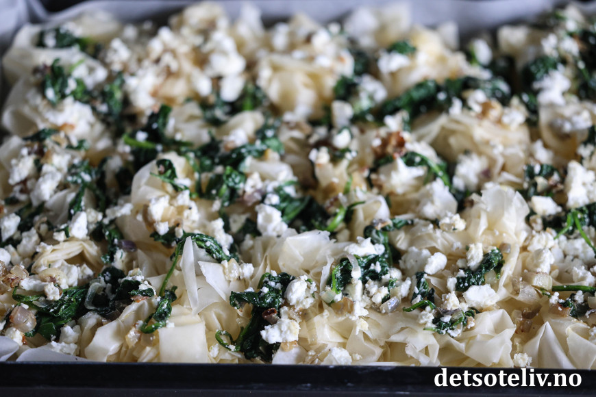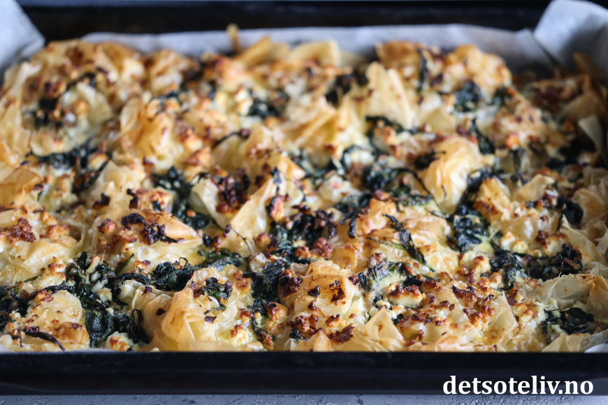 Her lages paien med en moderne vri i langpanne, og er ekstra lettvint fordi filodeigen bare skal pensles med smeltet smør og deretter krølles sammen til baller og legges i langpannen. Spinat- og fetaostfyllet legges deretter oppå og i sprekkene mellom deigflakene, og så helles det over en kremete fløte- og eggeblanding som gjør at hele paien henger godt sammen etter steking. Den ferdigstekte paien skjæres deretter i firkanter.