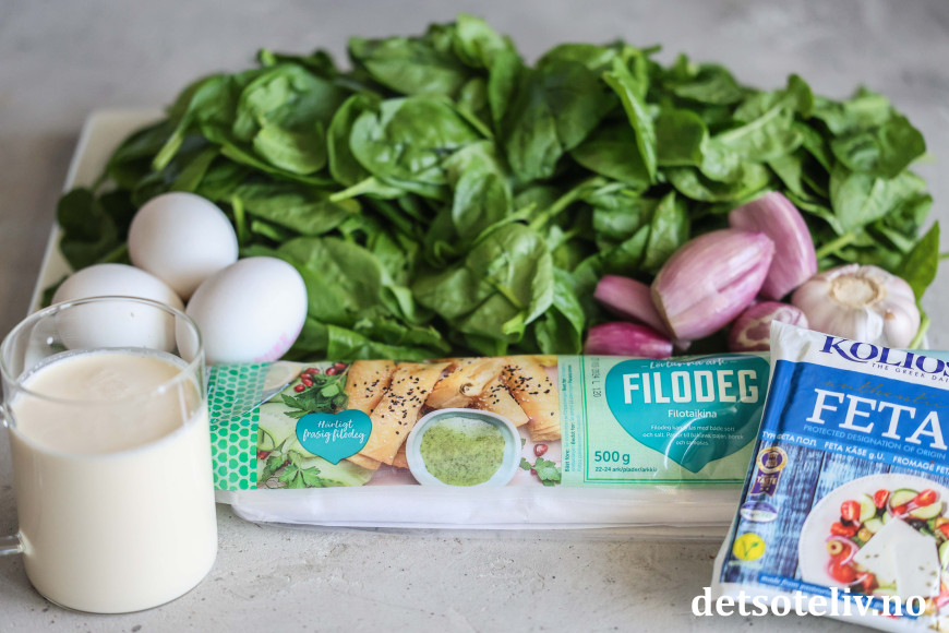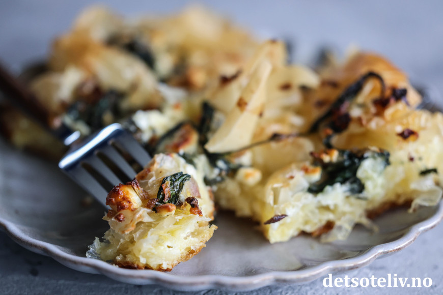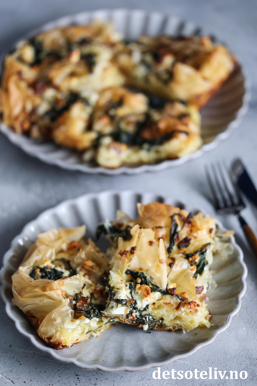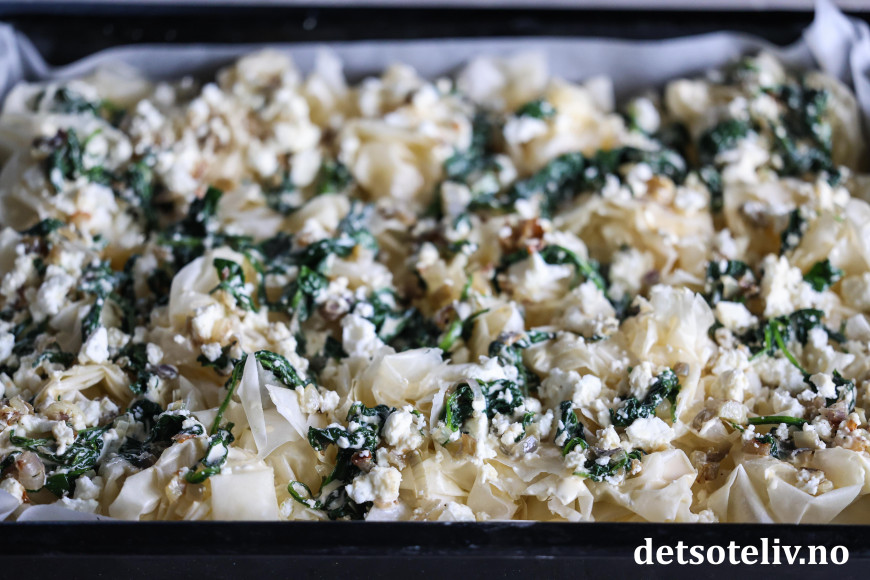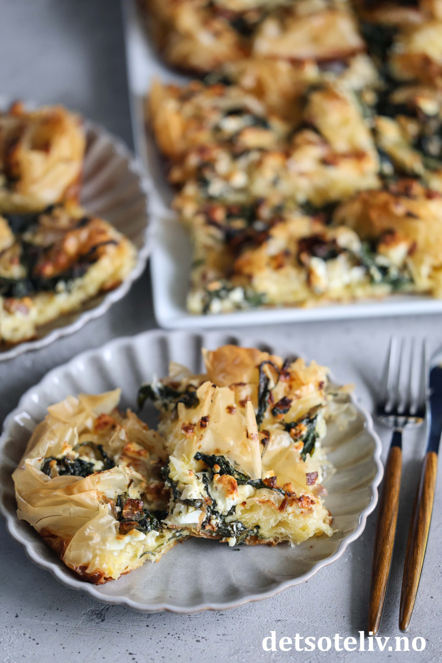 Her lages paien med en moderne vri i langpanne, og er ekstra lettvint fordi filodeigen bare skal pensles med smeltet smør og deretter krølles sammen til baller og legges i langpannen. Spinat- og fetaostfyllet legges deretter oppå og i sprekkene mellom deigflakene, og så helles det over en kremete fløte- og eggeblanding som gjør at hele paien henger godt sammen etter steking. Den ferdigstekte paien skjæres deretter i firkanter.