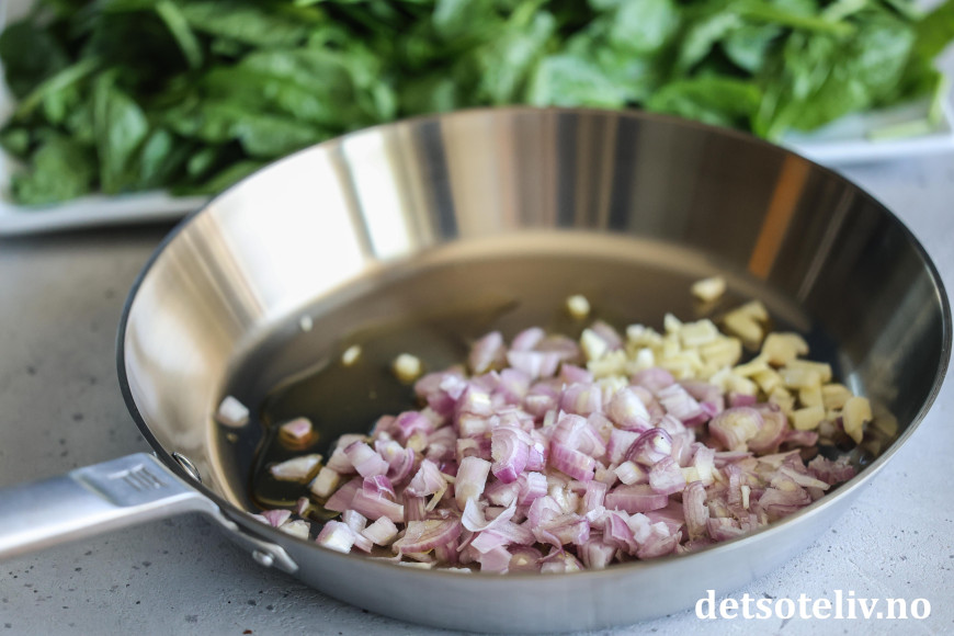 Ha olje i en stekepanne. Finhakk sjalottløk (eller vanlig gul løk) og hvitløk og ha dette i pannen. Stek løken på middels varme i et par minutter til den er blank og gyllen. Ha spinatbladene i stekepannen og la de steke med til du ser at de blir myke og klapper sammen i volum. Bland godt sammen og krydre med kvernet salt og pepper.