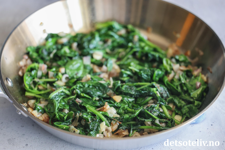 Stek løken på middels varme i et par minutter til den er blank og gyllen. Ha spinatbladene i stekepannen og la de steke med til du ser at de blir myke og klapper sammen i volum. Bland godt sammen og krydre med kvernet salt og pepper.