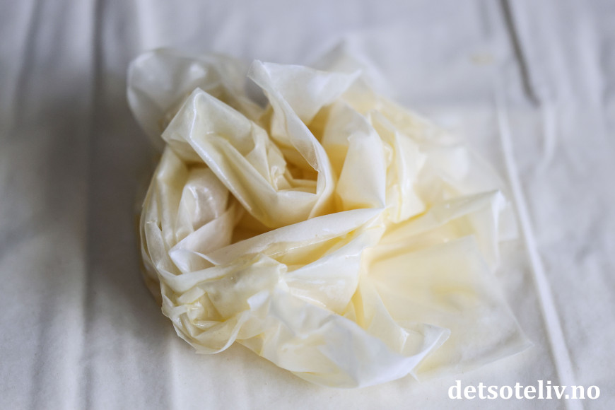 Ta filodeigen ut av pakningen og brett deigen flatt utover. Pensle hvert deigflak med et tynt lag smeltet smør. Krøll deigflaket deretter sammen til en luftig ball.