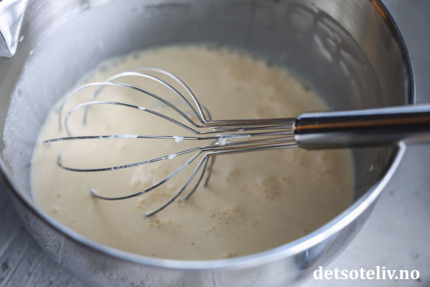 Visp egg, fløte, crème fraîche og salt raskt sammen.