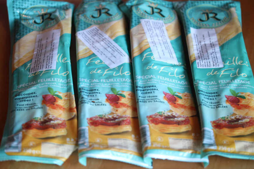 På bildet ser du 4 pakker med filodeig. Til denne oppskriften trengte jeg bare å bruke 1 slik pakke på 250 gram.