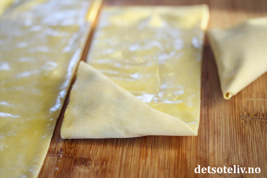 Legg en stor spiseskje fyll i enden på hver remse. Brett det ene hjørnet av deigen over fyllet slik at du får en trekant nederst på remsen. Brett så oppover langsmed hele deigremsen slik at du får en triangel der fyllet ligger i midten.