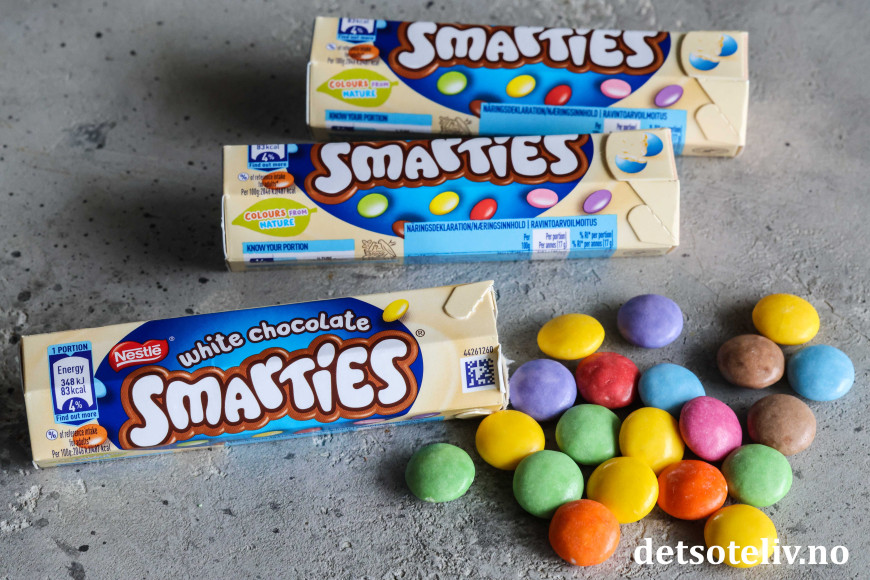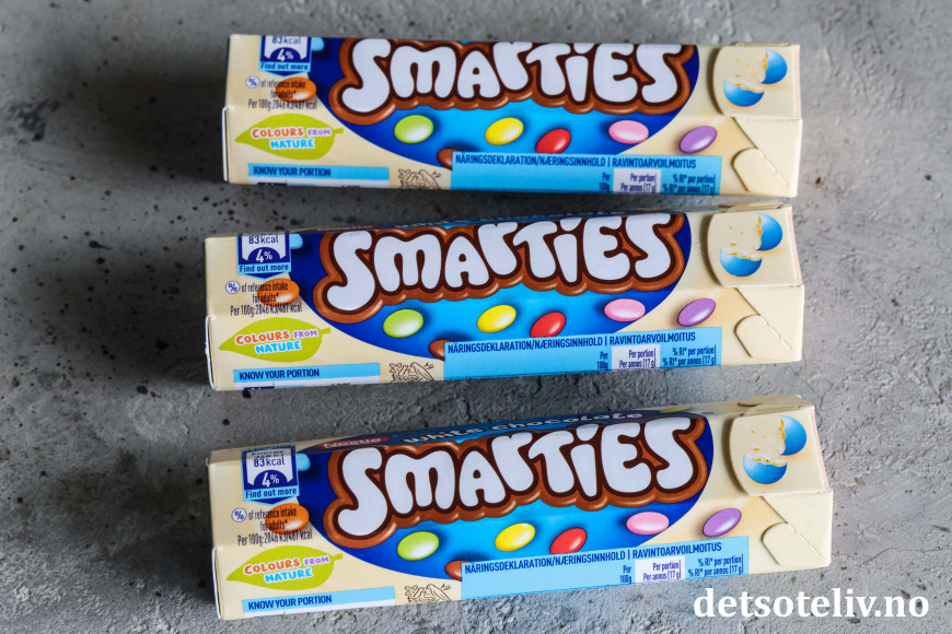 ♥ Jeg brukte her en type Smarties som har hvit sjokolade inni. Det går helt fint å bruke vanlige Smarties med mørk sjokolade inni eller gule Non stop.
