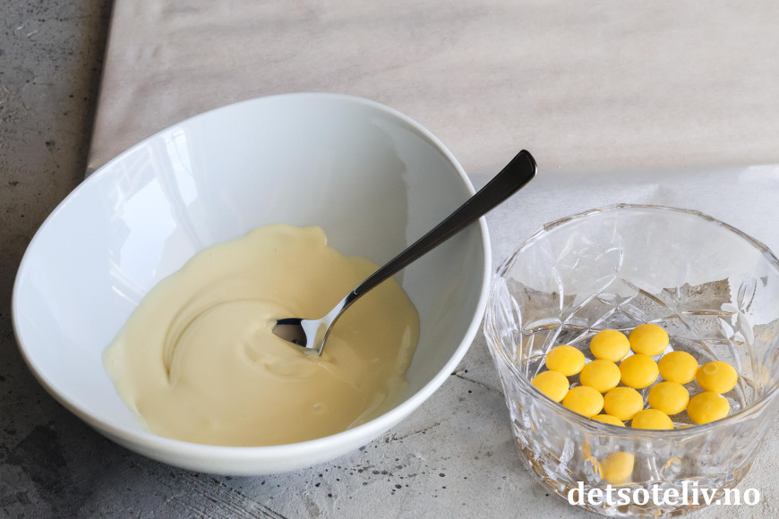 Ha den hvite sjokoladen i en skål. Finn frem gule Smarties eller Non stop.