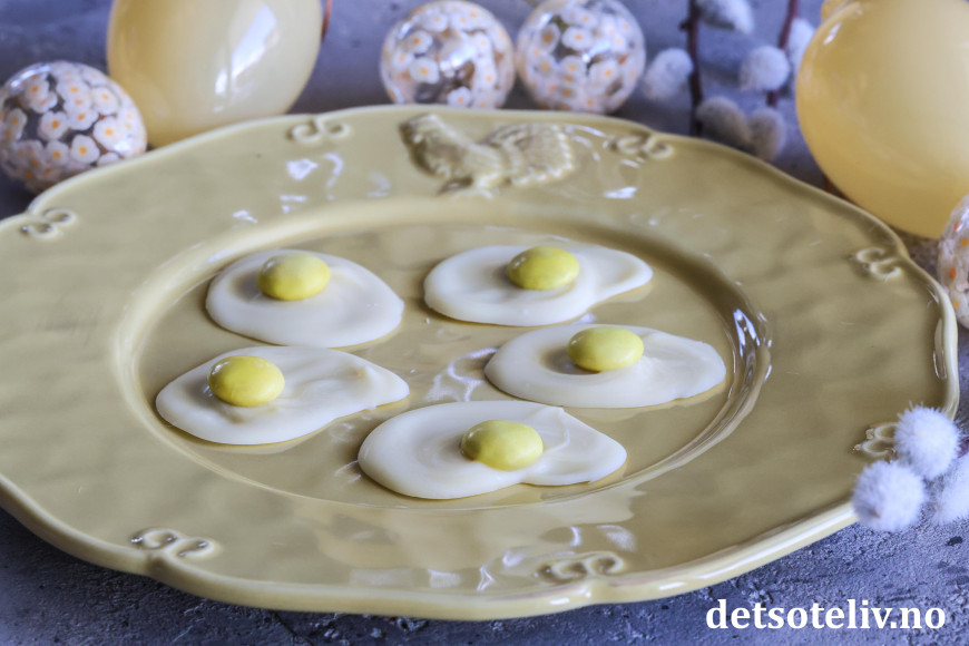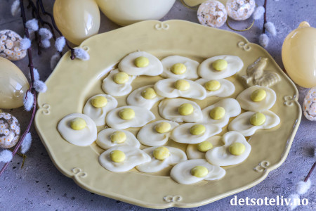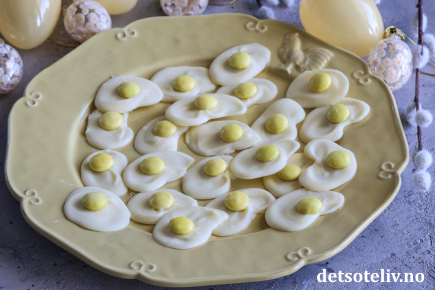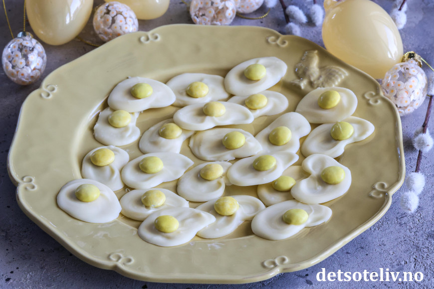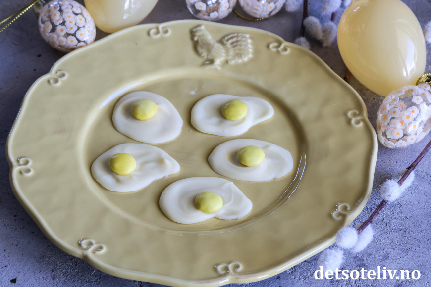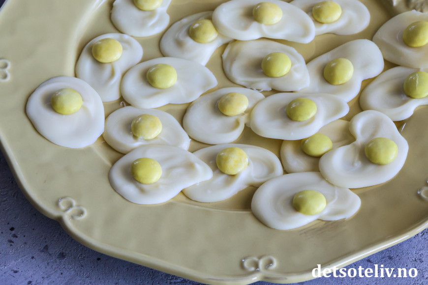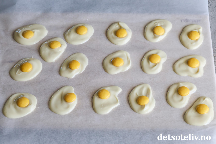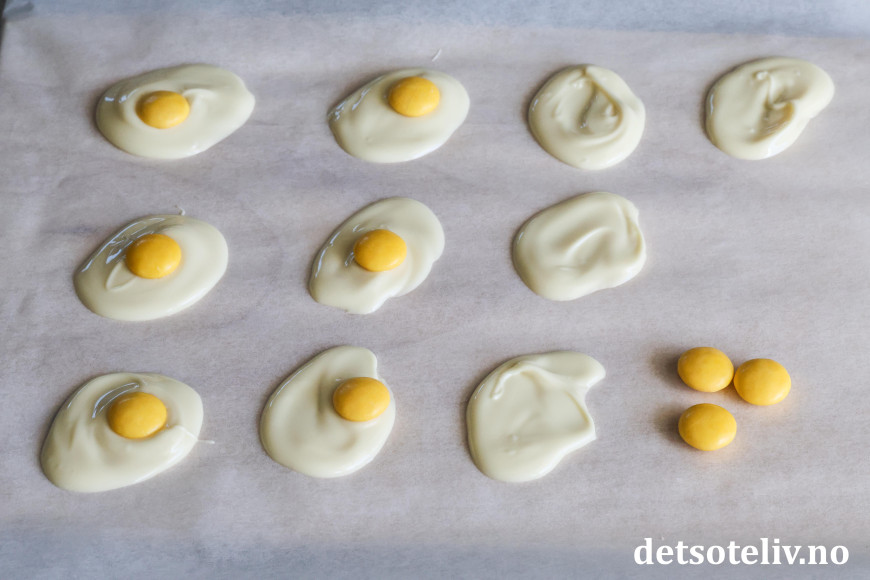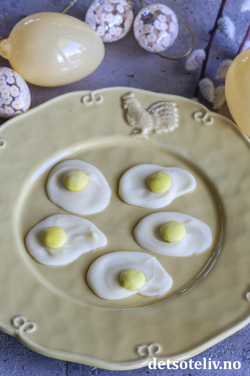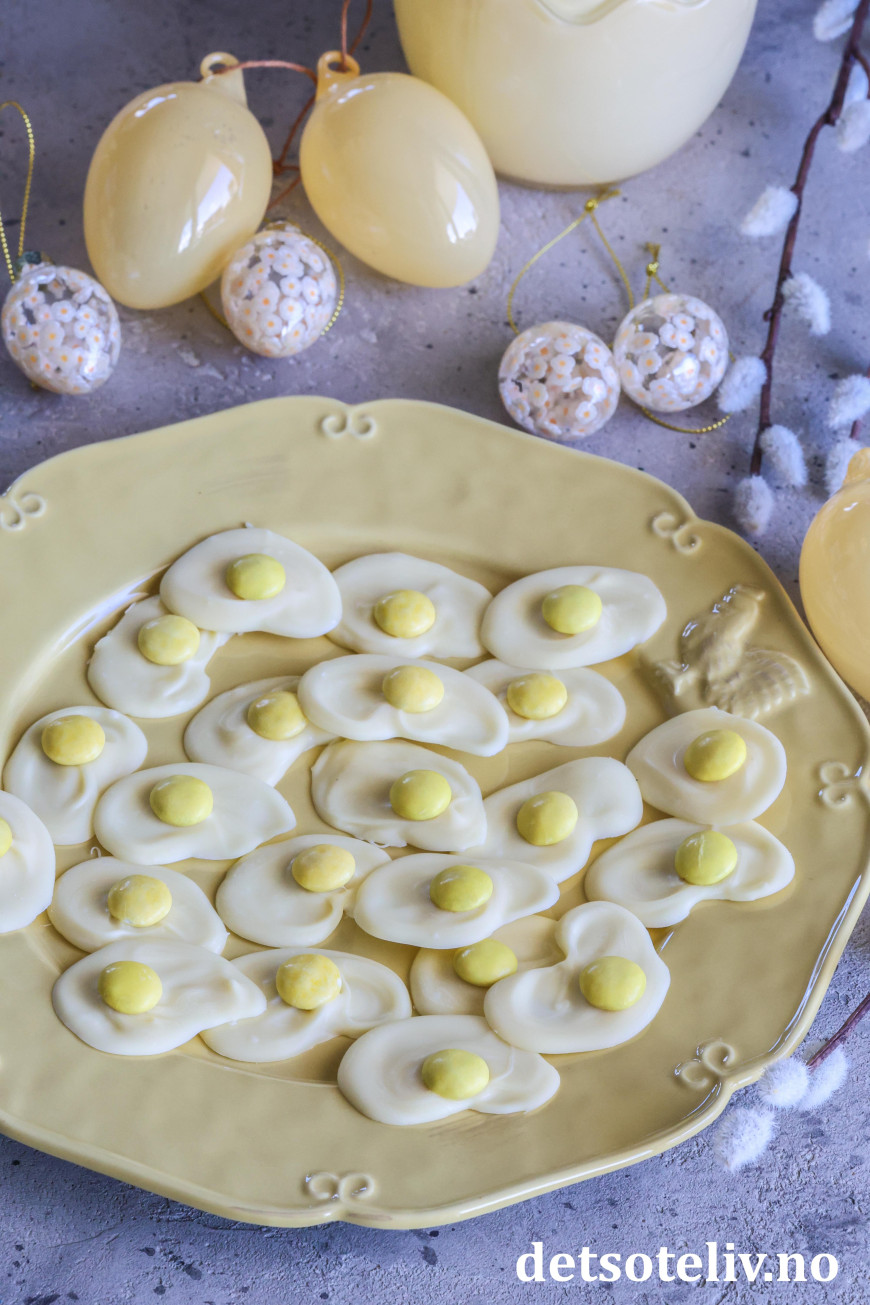 Med hvit sjokolade og gule Smarties eller Non stop er det lett å lage søt konfekt som ser ut som speilegg.