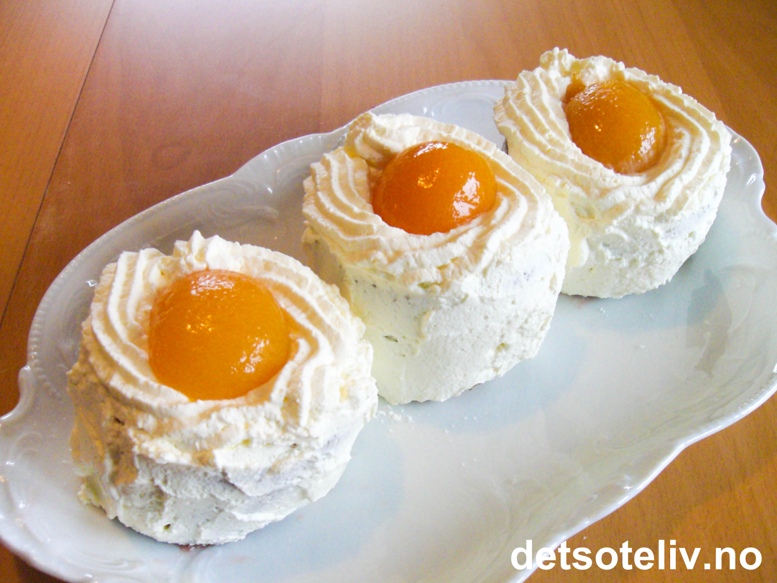 Før servering skjæres rullekaken opp i tykke skiver på 4-5 cm. Legg skivene på tallerkener. Pisk kremfløten til krem sammen med melis. Smør et jevnt lag med pisket krem rundt hver kake og sprøyt et ring med krem på toppen av hver kake. La aprikosene renne godt av. Legg en halv aprikos på toppen av hver kake til pynt.