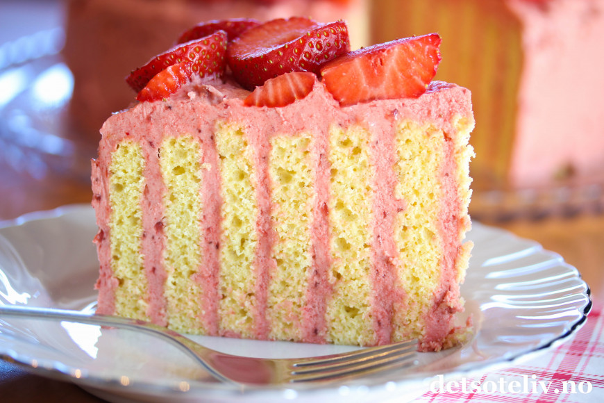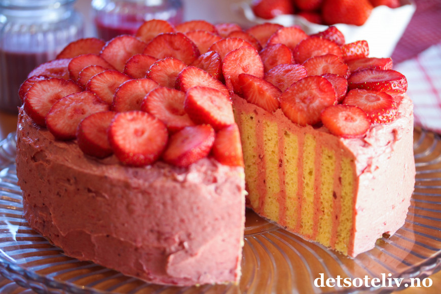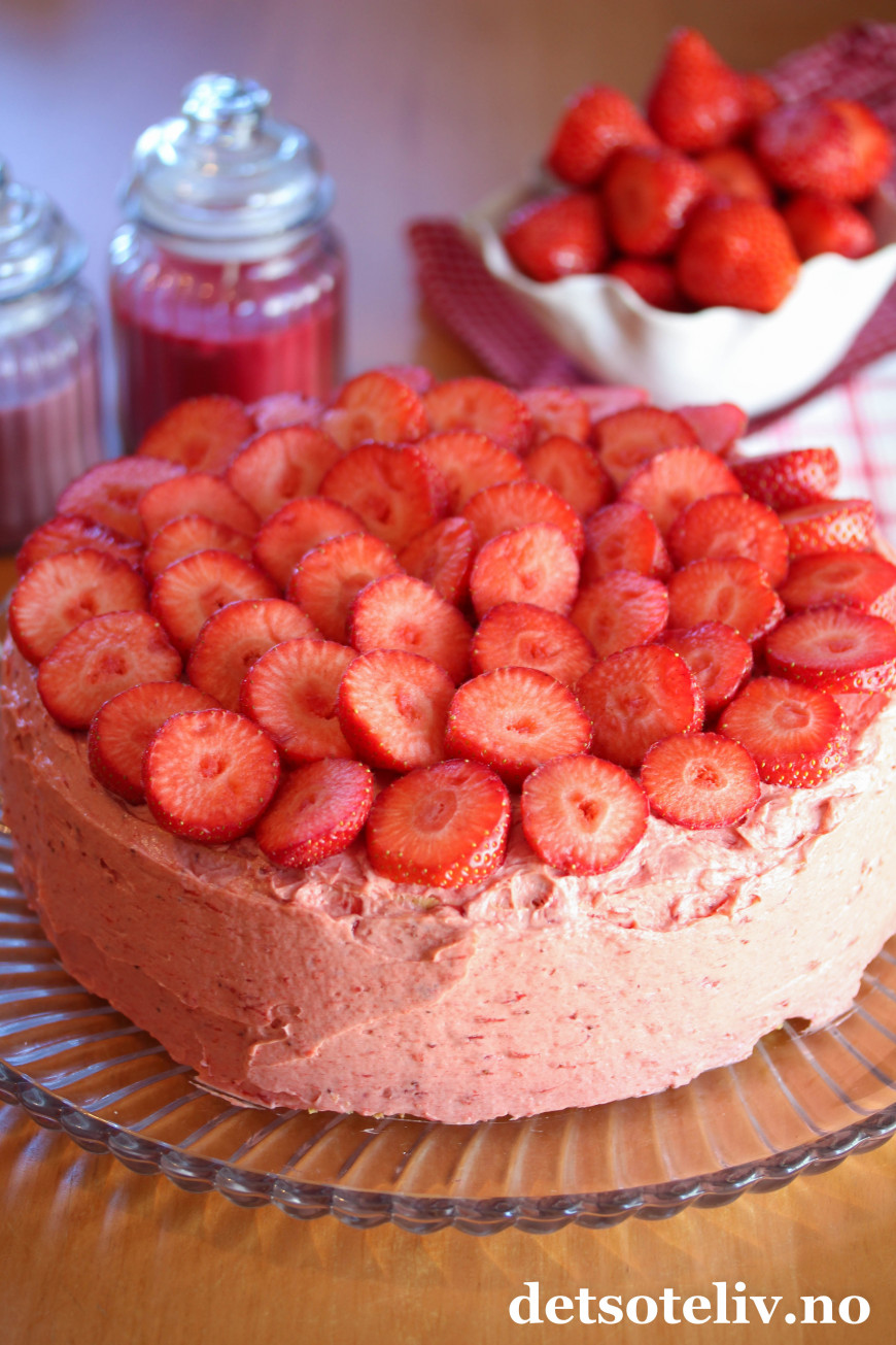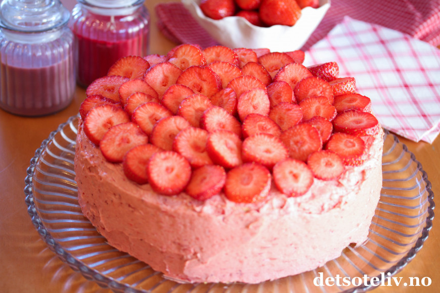 ♥ Kaken smaker aller best når den er romtemperert fordi jordbærsmørkremen da er myk og deilig. Kaken kan oppbevares i kjøleskapet i et par dager, men ta kaken ut av kjøleskapet i minst en halvtime før servering, så jordbærsmørkremen mykner igjen før du skjærer i kaken.
