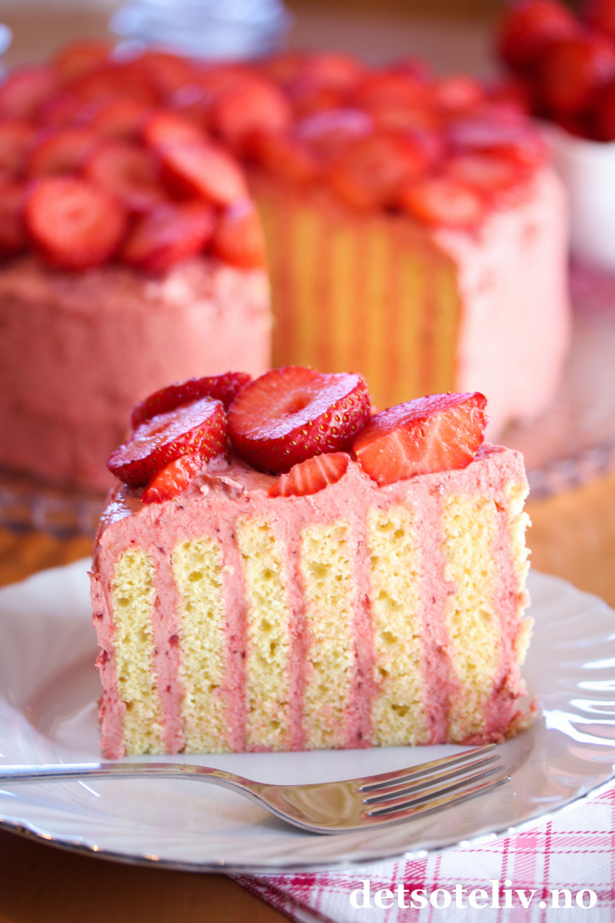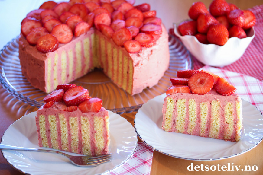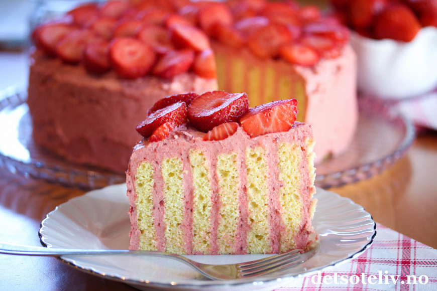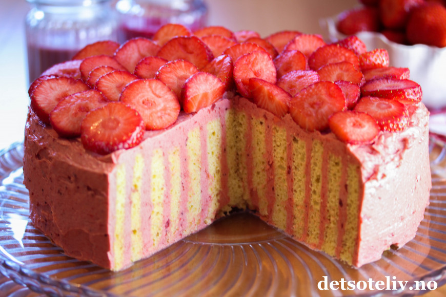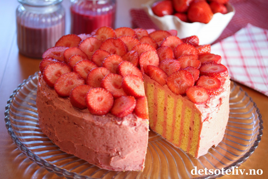 ♥ Bruk søte jordbær for å få god jordbærsmak på kremen. Hvis du synes kremen smaker for lite jordbær, kan du forsiktig blande i litt ekstra jordbærsyltetøy. Bruk da fast jordbærsyltetøy og ikke rennende, ellers blir kremen for tynn i konsistensen. Det går også å smøre et tynt lag jordbærsyltetøy på kakestripene før du smører på kremen.
