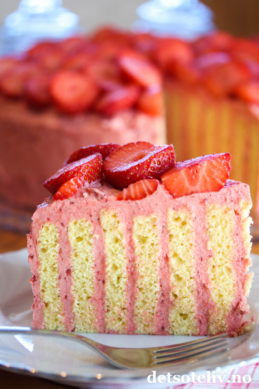 ♥ Denne kaken er nokså mektig og bør serveres i smale kakestykker. Friske jordbær balanserer godt resten av kaken. Jordbærsmaken forsterkes når du pynter kaken med masse friske jordbær.