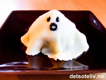 Hvis du ikke synes at muffinsene blir høye nok, kan du forme en topp med litt sjokoladekrem eller ha noe sjokoladegodteri under marsipanen, slik at du får tilstrekkelig høyde på spøkelsene.