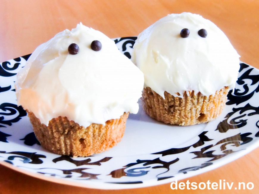 Så enkelt kan det gjøres... Og jeg synes disse spøkelsescupcakesene er så søte...:-) Oppskriften på "Spooky Cupcakes" som du ser på bildet består av kjempegode gulrotmuffins med deilig, hvit ostekrem på toppen, men du kan også bruke andre typer muffins som du dekker med hvit ostekrem. Oppskriften gir 24 stk.
