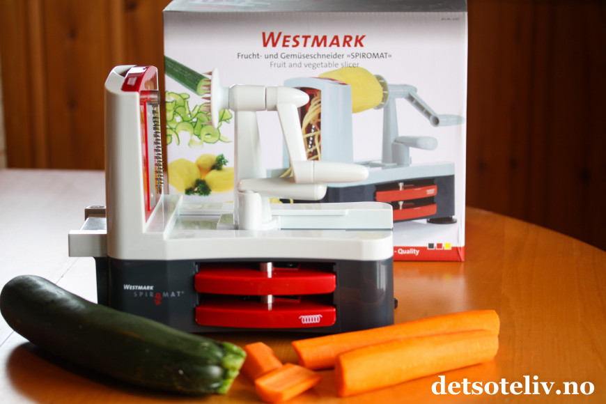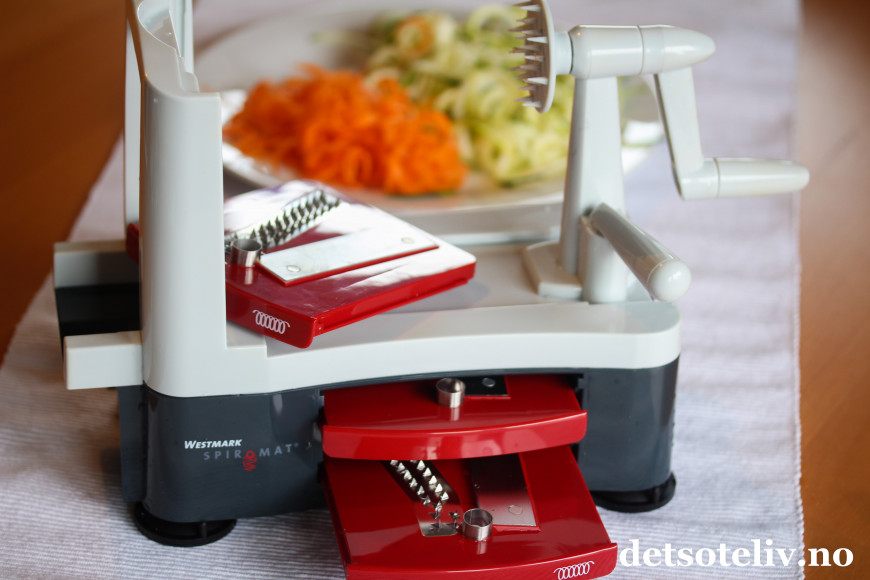 Jeg brukte som sagt Westmark Spiromat Frukt- og Grønnsaksskjærer som man enkelt kan lage både spiraler, spagetti-strimler og ringer med.