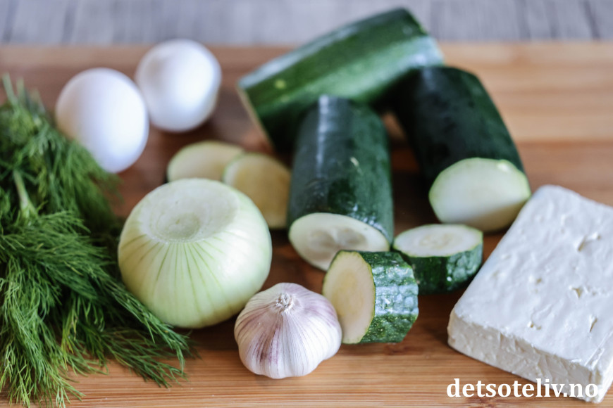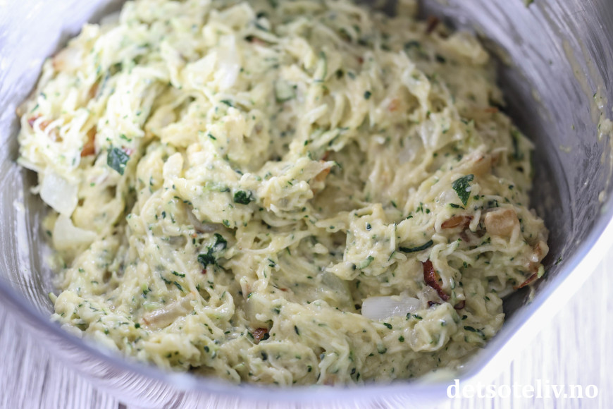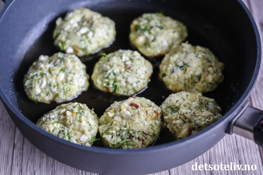 Rør sammen egg og hvetemel til en tykk grøt. Tilsett den revne squashen som du har presset væsken ut av og stekt løk/hvitløk. Rør dette godt sammen. Bland så inn hakket dill og smuldret fetaost.