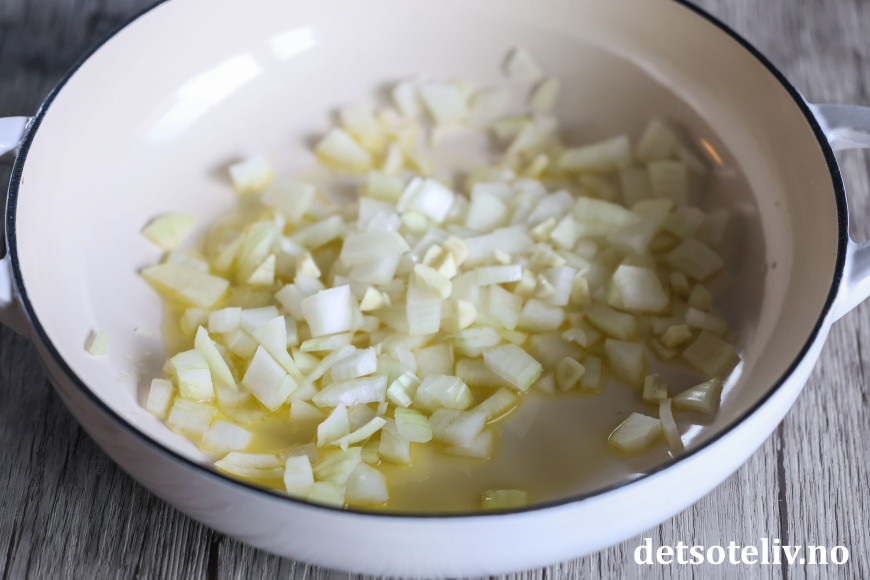 Hakk løk og hvitløk og ha dette i en panne sammen med olivenolje.