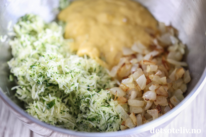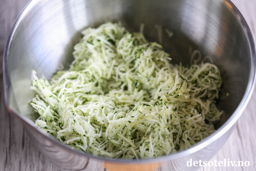 ♥ Ikke hopp over prosessen med å salte squashen og så presse ut væsken før du blander inn resten av ingrediensene. I likhet med agurk består squash av 95% vann, så det er virkelig et poeng å få presset ut noe av dette, ellers blir røren for tynn og squashkakene bløte, flate og henger dårligere sammen.