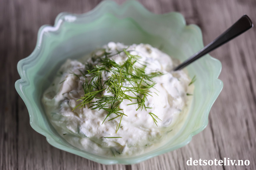 Og en deilig Yoghurtsaus med hvitløk og dill, der ingrediensene bare røres raskt sammen (se grundigere beskrivelse og flere bilder i innlegget HER).
