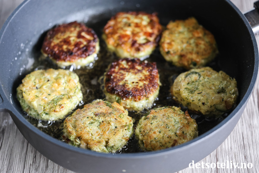 Når squashkakene er fint stekt på utsiden, kan du senke varmen, sette på lokk og la squashkakene steke i noen minutter til, til du ser at squashkakene har blitt helt gjennomstekte inni også. Alternativt kan du flytte squashkakene over i en ildfast form, dekke til med aluminiumsfolie og ettersteke dem i ovnen ved 180°C i ca. 10 minutter.