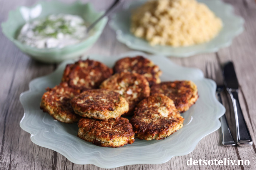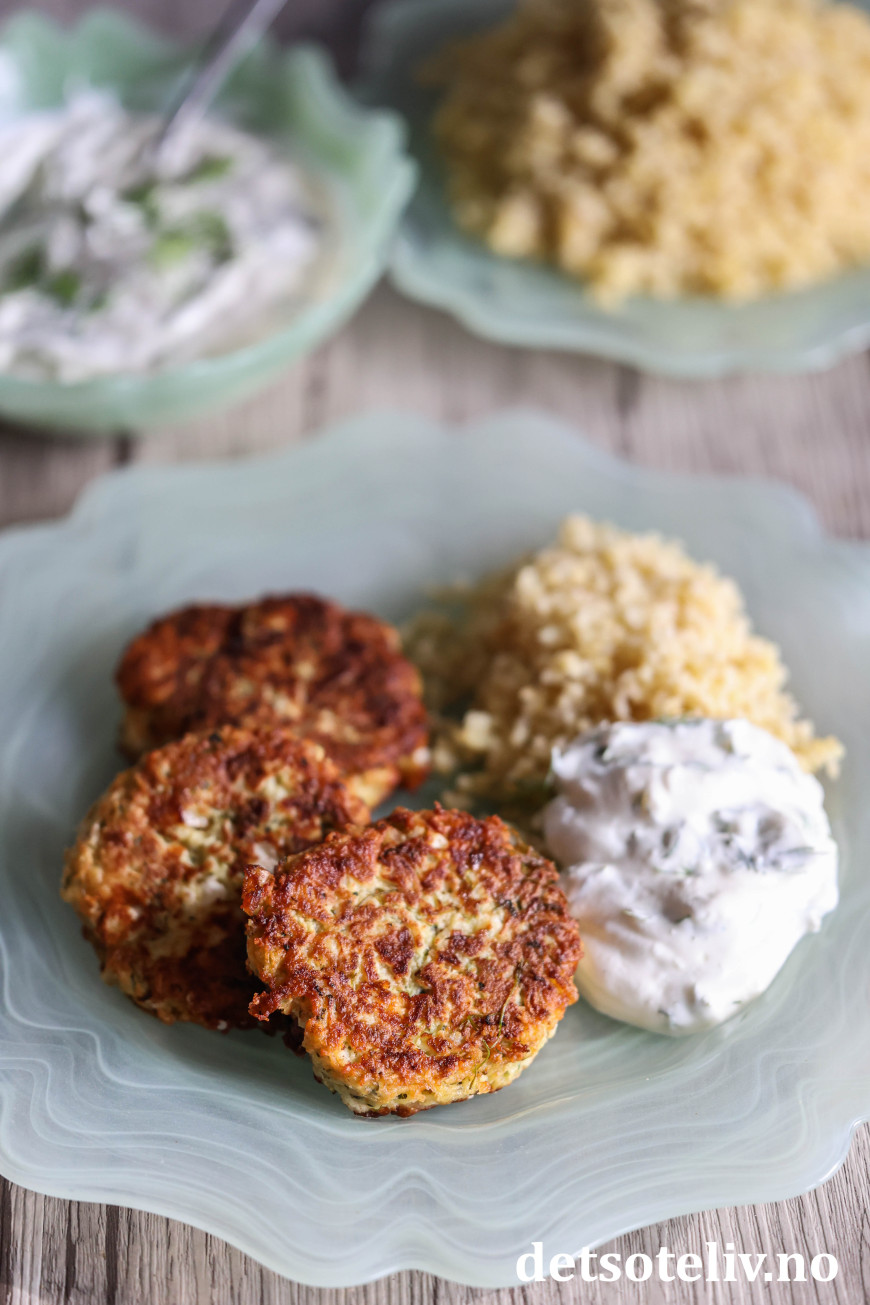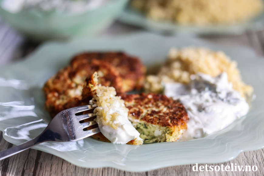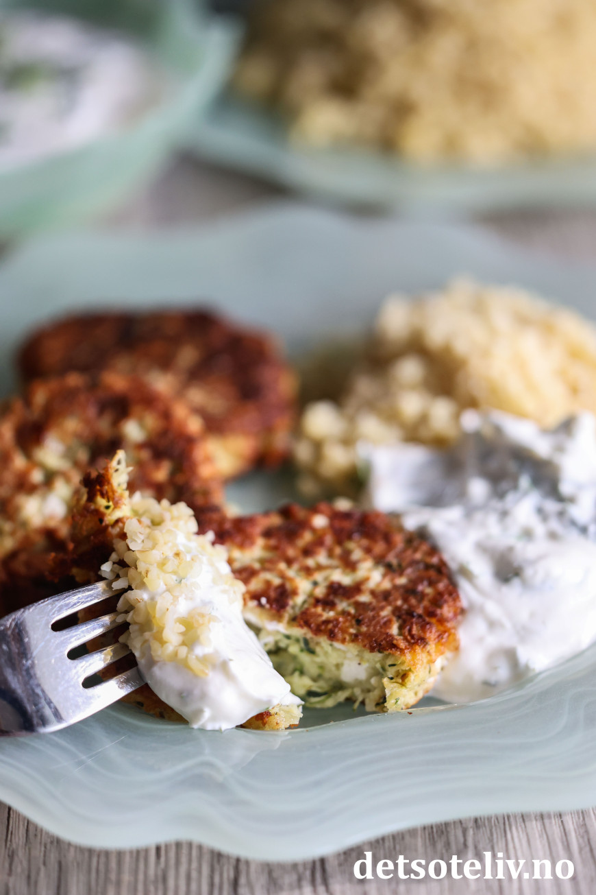 Squashkakene er også fine å sette på et bord sammen med forskjellige andre småretter. Forslag til tilbehør er ris, byggryn eller stekte poteter, og gjerne en grønn salat eller Gresk salat og Tzatziki. Her serverer jeg squashkakene sammen med kokt bulgur og en frisk Yoghurtsaus med hvitløk og dill.