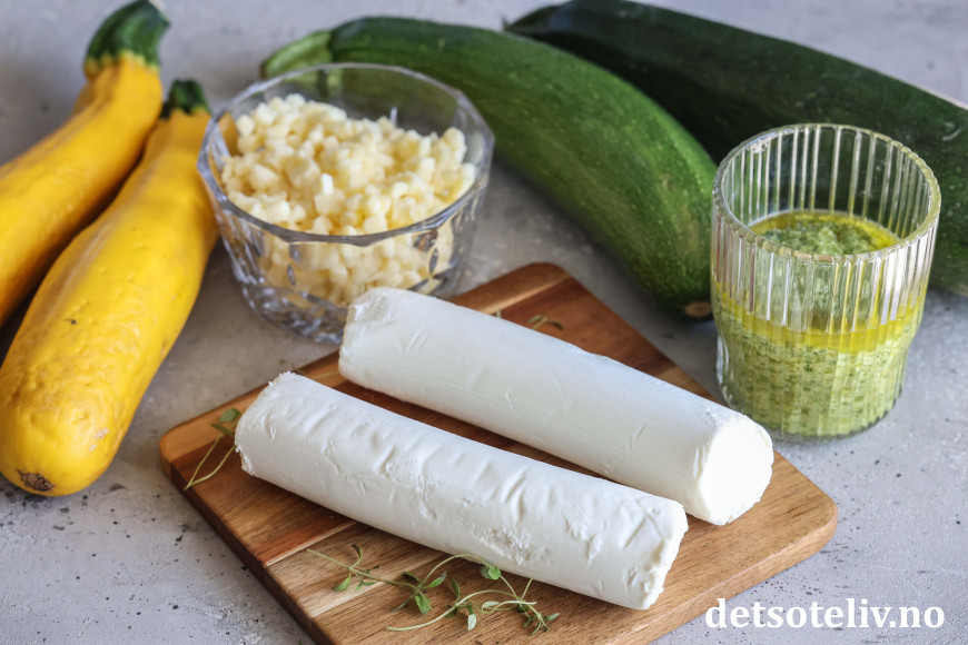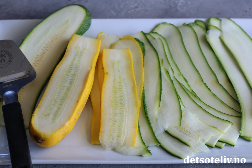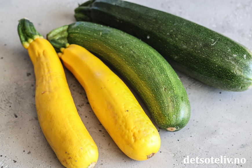 ♥ Prøv å finne squash som er omtrent like store. De bør dessuten være mest mulig rette i fasongen, og ikke for tykke, for at det skal gå greit å skjære pene skiver med ostehøvelen.