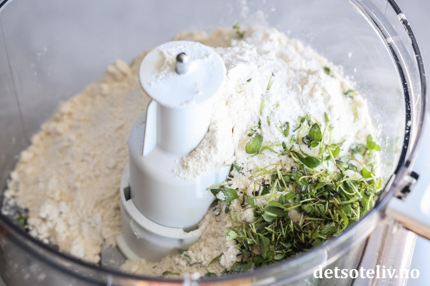 Ha mel, bakepulver, salt og frisk timian i en food processor med hakkekniv.