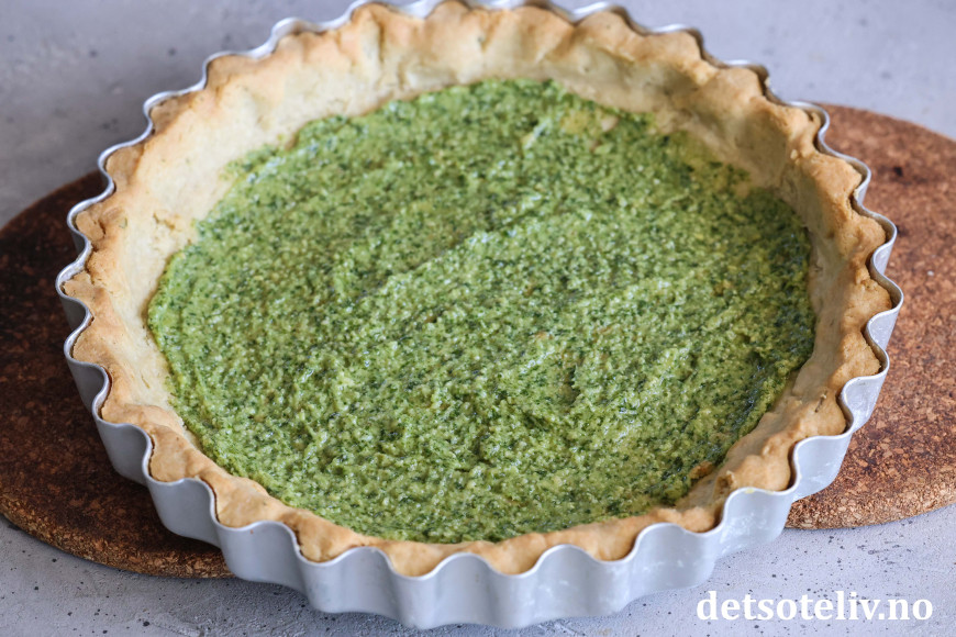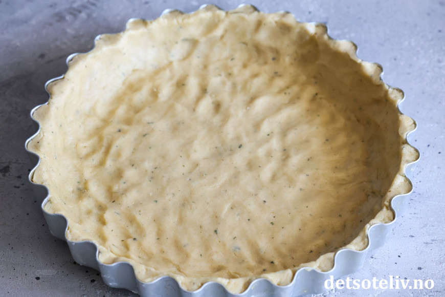 Klem deigen utover i en godt smurt paiform (26 - 28 cm i diameter).
