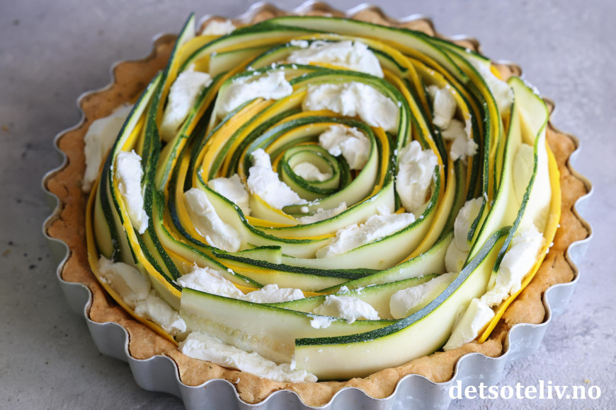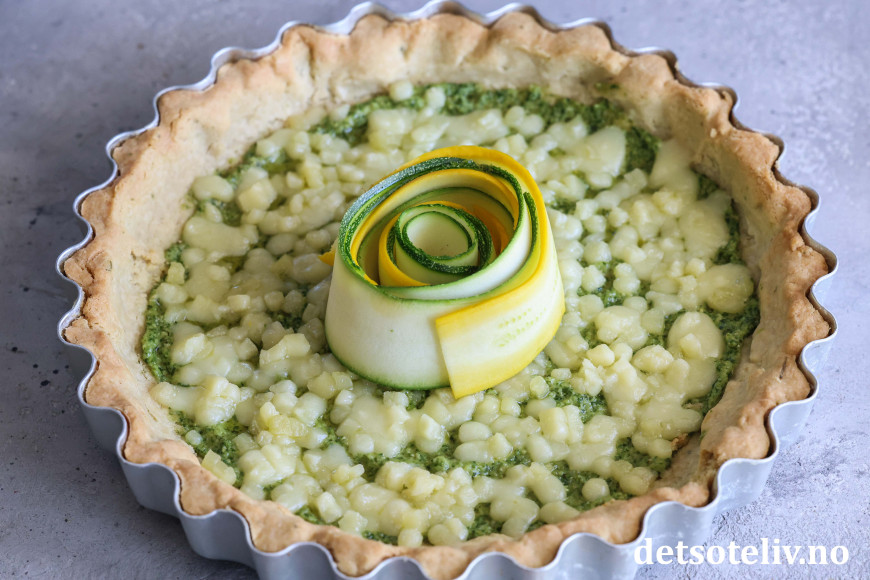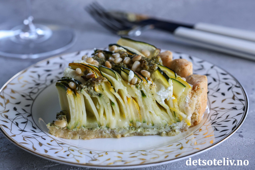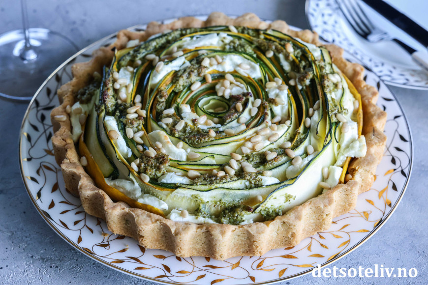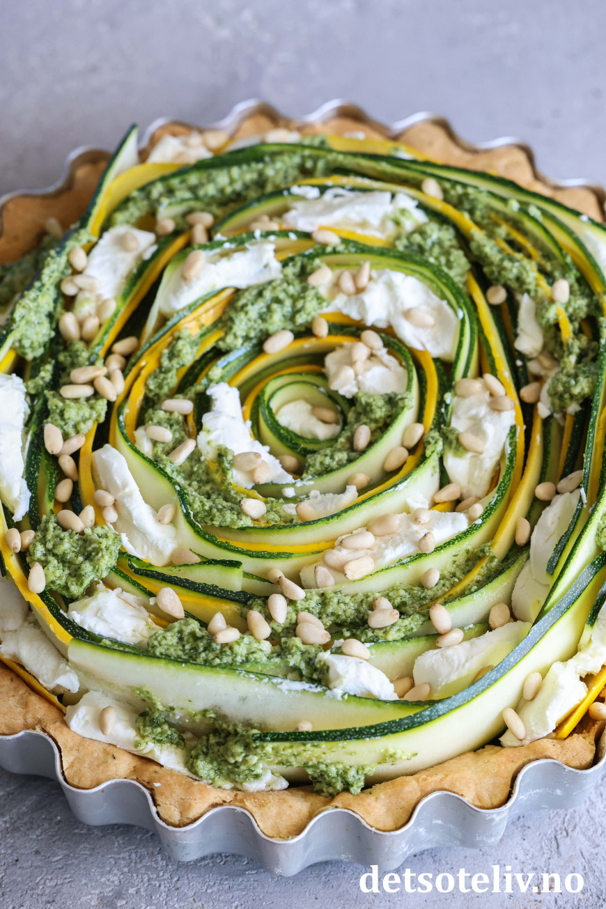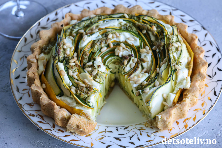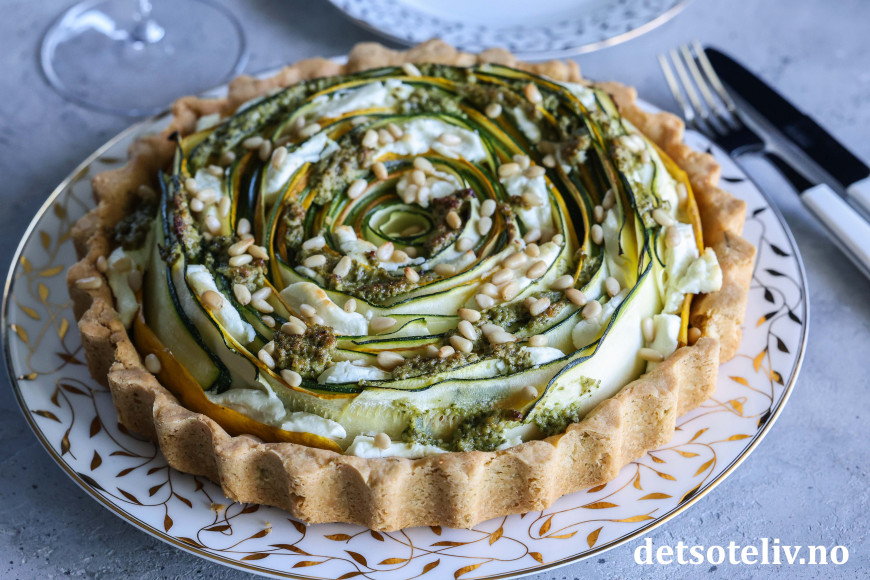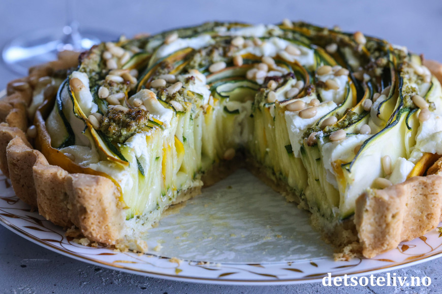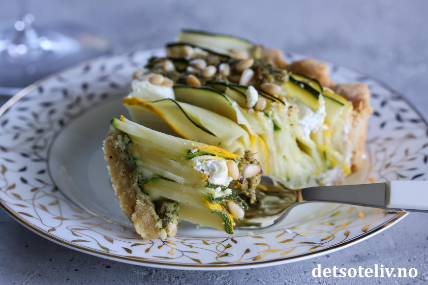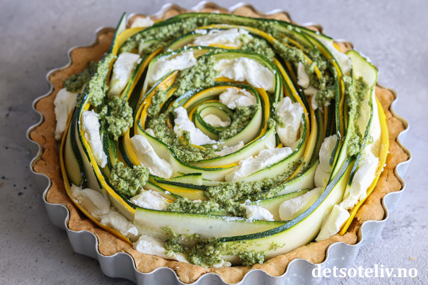 Paien er franskinspirert (Tarte aux courgettes et chèvre), med italiensk innslag på grunn av pestoen.