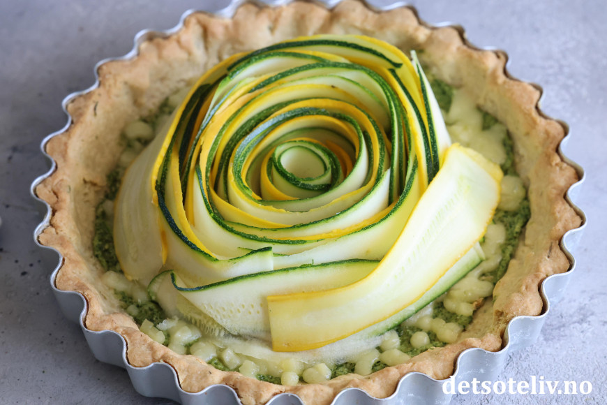Paibunnen inneholder frisk timian og chèvre, som gir den ekstra god smak. Etter forsteking smøres paibunnen med pesto og drysses med mozzarella. Så toppes paien med grønne og gule skiver av squash, som legges i en spiral oppå paien. Innimellom squashskivene er det mer pesto og chèvre og et dryss pinjekjerner.