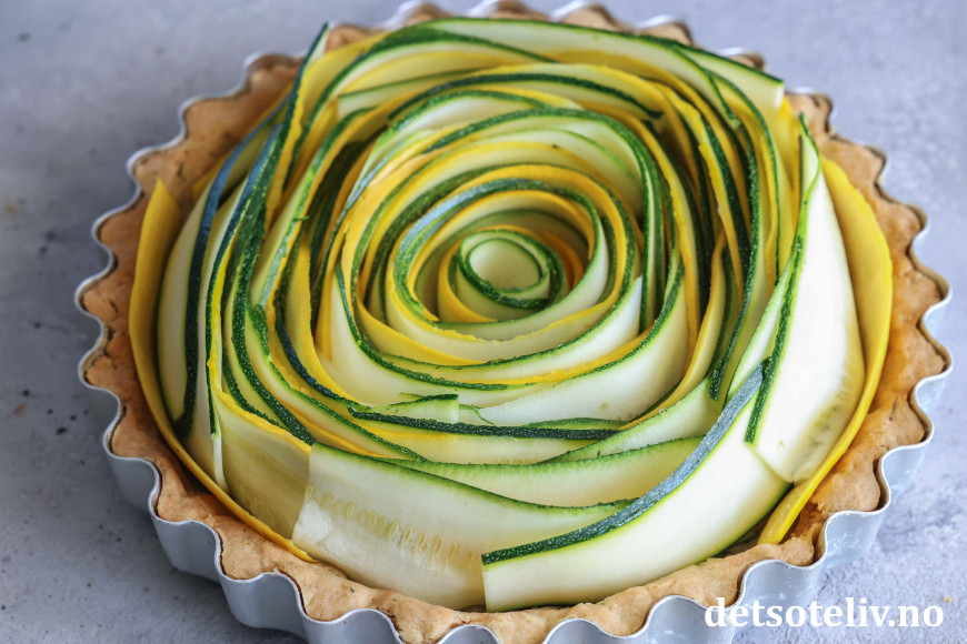 Form squashskivene til en spiral oppå paien. Start innerst og bygg spiralen utover til kanten av formen.