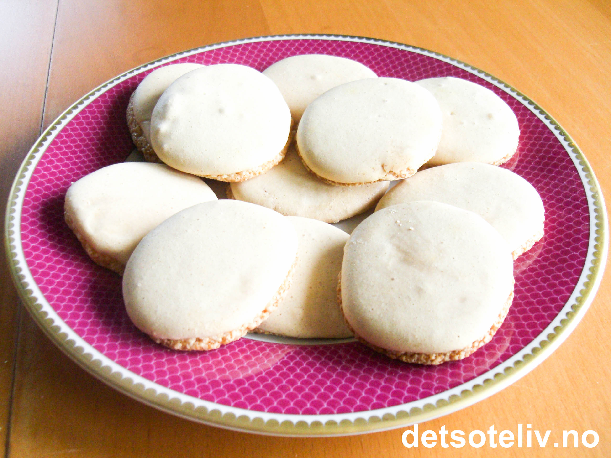 Sett deigen i små klatter ved hjelp av to teskjeer på bakepapirdekkede stekeplater. Beregn litt avstand mellom hver kake. La kakene stå et par timer i romtemperatur.