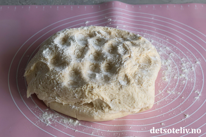 Bland salt med hvetemelet og ha dette i bollen. Elt deigen sammen til den blir god og smidig – bruk gjerne kjøkkenmaskin med eltekrok.